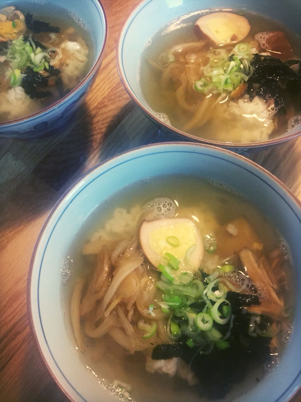 18. 멸치 다시마 대파 양파 표고 마늘. 간만 제대로 육수. 밥솥에 찬 밥이 많아서 잔치국수 대신 국밥. 양파를 갈색 나도록 볶고, 육수 내던 버섯은 간장설탕에 살짝 양념해 고명으로 올렸다. 계란, 김과 파 마무리