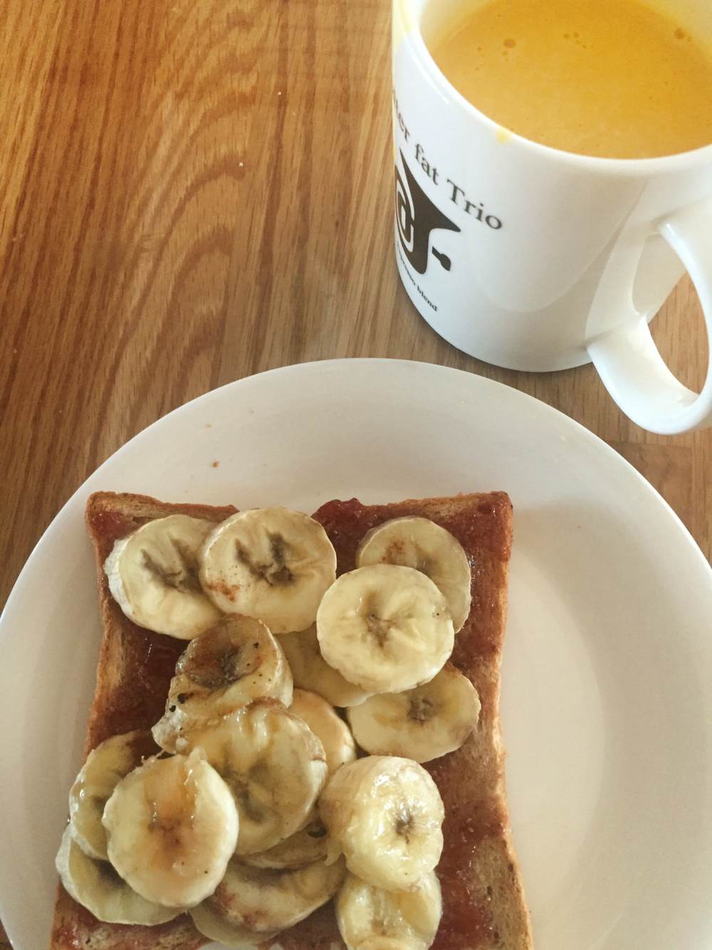 14. 바나나 처리용 메뉴. 식빵에 딸기잼을 바른 뒤 바나나를 얇게 썰어 얹어서 오븐에 구웠다. 계피가루를 살짝 뿌려서 하는게 포인트. 단호박스프엔 우유를 더 부어 라떼처럼 만들었다. 달다구리 아침. 애들은 좋단다.