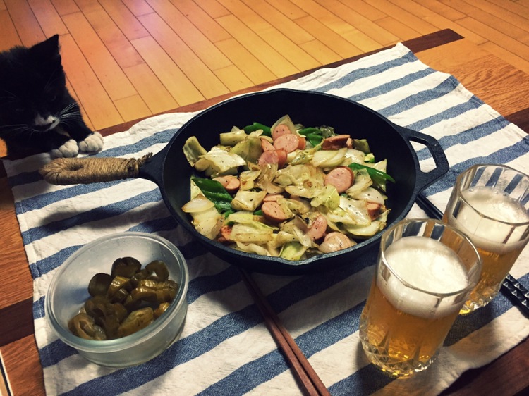 43. 간만 평일 가정 치맥 할까 하다가, 양배추 양파를 볶고 소세지, 고추를 더해 야채 위주로. 가정식 안주에 한 잔. 무쇠팬 뜨거운데 냥이가 쪼르르 호시탐탐. 세월 참.. 해고 4주년이다ㅎ