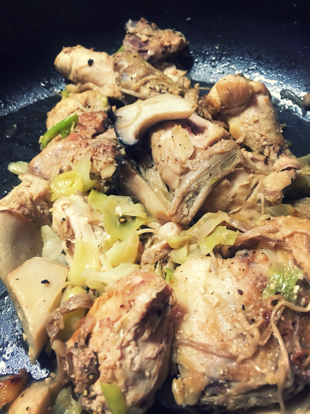 38. 냉동닭 급히 녹여 점심 때 대충 초벌구이 해놓고 외출. 팽이버섯 새송이버섯 양배추는 해치울 요량이었는데 사실 더 맛났다. 저녁 다 되어 귀가해 버터 녹여 야채를 파마늘에 볶다가 닭까지 소금,간장,후추로 마무리