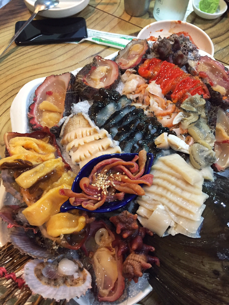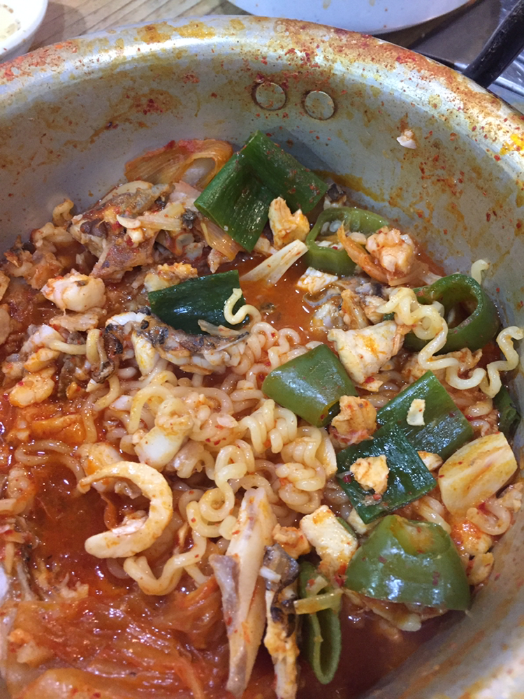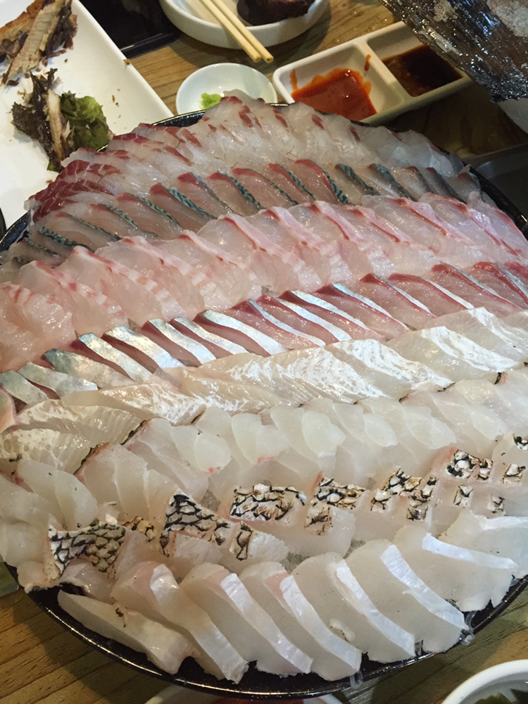 52. S이 초대한 자리에 갔더니 옆 테이블도 아는 얼굴. 중복된 약속을 합쳐버린 S 센스ㅋ 정작 계산은 E가. 메뉴판 가격은 나쁘지 않은데 알고보니 비싼 '싯가' 메뉴였고. 어쩐지 해물도 훌륭하고 민어회는 고소. 남은 회 넣어 매운탕라면. 강남역 강남보물섬