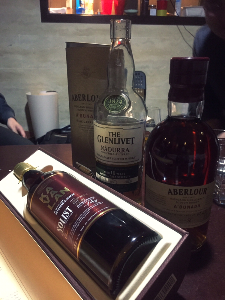38. 한시절 위스키를 벗했던 K님 덕에 위스키 호사. 그의 추천으로 내가 쏜 글렌리벳 나두라, 맘에 들었다. 그는 또다른 매력의 아벨라워와 맛만 보라고 대만 카발란까지 싸들고 오셨고. 카카오톡 주문하기로 안주 실험