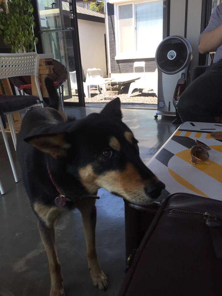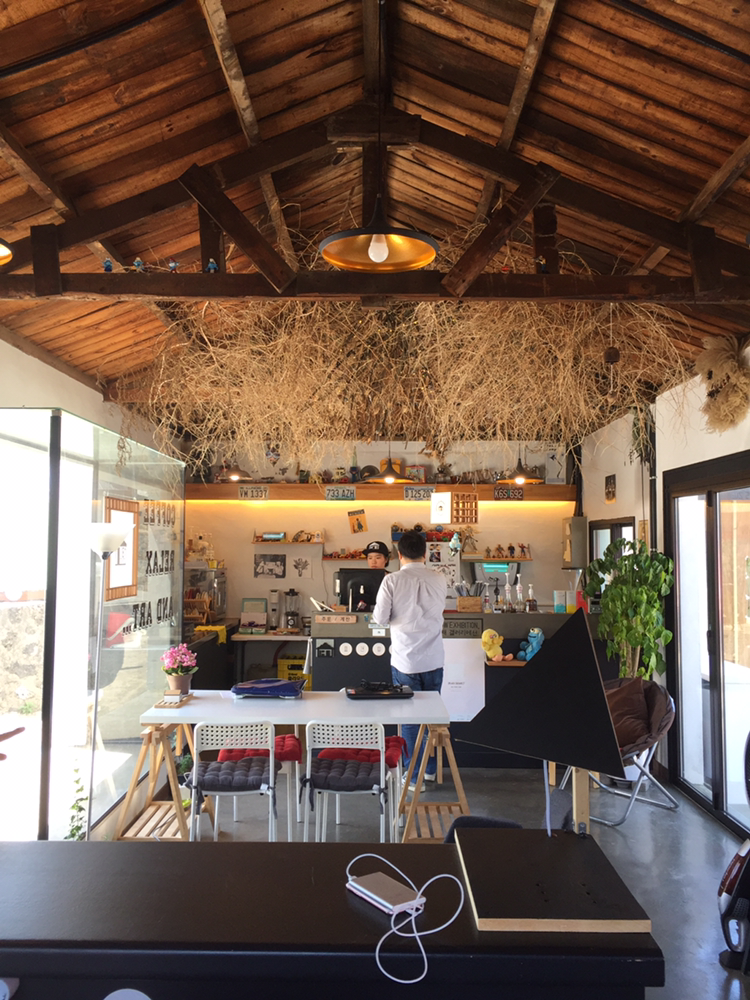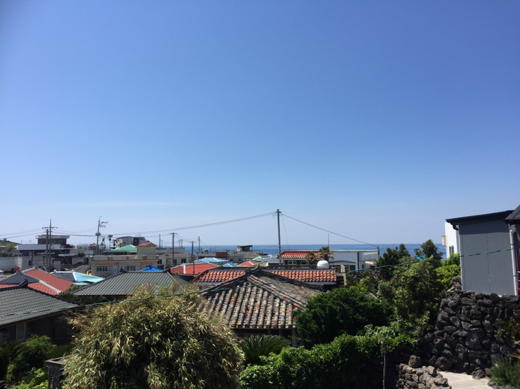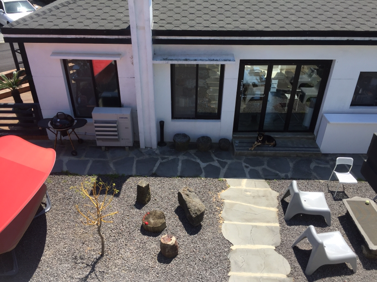48. 밥 먹고 차 한 잔 하려다 결국 각자 놋북 꺼내 일하던 오후. 작은 카페를 지키는 블랙탄 검은 짓돗개 뀨는 첨에 낯선 이들에게 맹렬히 짓다가 주문한 차를 마시고 있으면 손님 알아보고 상냥. 마당 건너 옥상에선 낮은 지붕들과 바다 풍광. 제주시 18번가
