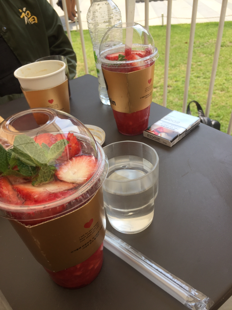 43. 국밥 후딱 흡입 후 조선일보 앞 카페. 딸기 모히토인지 맛나고, 하늘은 파랗고 잔디는 푸르다는걸 맘껏 즐기는 자리. 역시 곧 만석. 최근 후진 성희롱 사건들 얘기에, 그래도 세상이 변화하고 있는건 분명하고. 적응해야만 할 거라는 K옵바 옳아요. 펌프킨