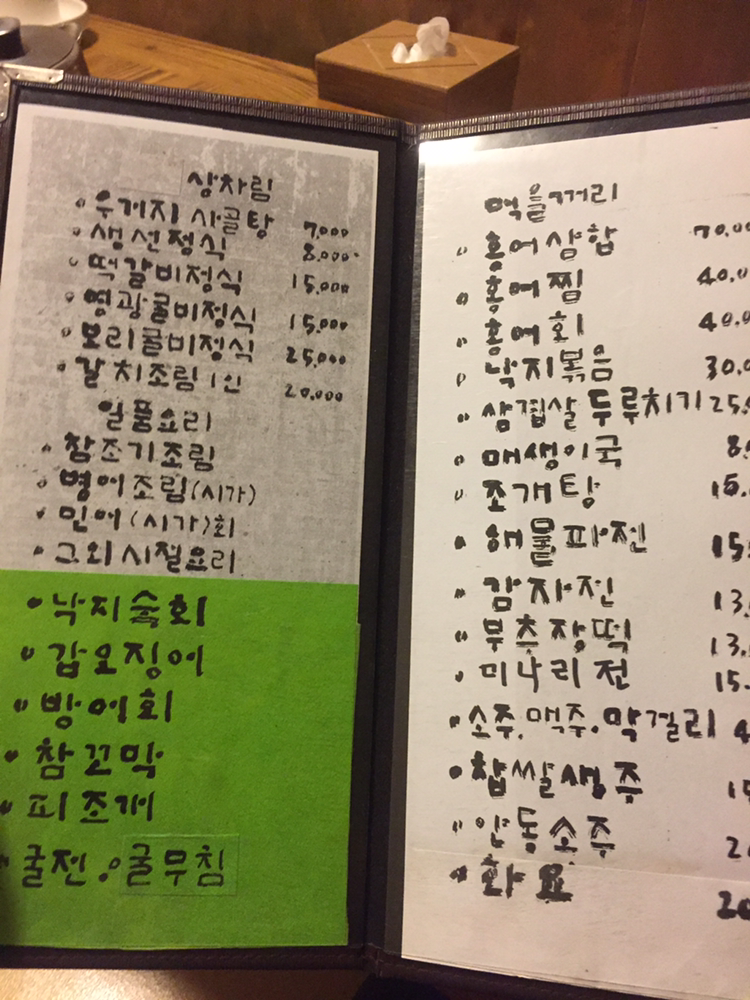 2. 20세기에 다니던 식당. 이름은 반가웠으나 서울시교육청 앞이 아파트 단지로 재개발되면서 적십자병원 뒷편으로 이전한지 꽤 됐다고. 어리굴젓 하나로 괜히 좋았고. K부장이 옛날 옛적 기억을 하나둘 꺼내는 바람에 당황하기도. 따뜻한 방 좋더라.서대문 곰마루