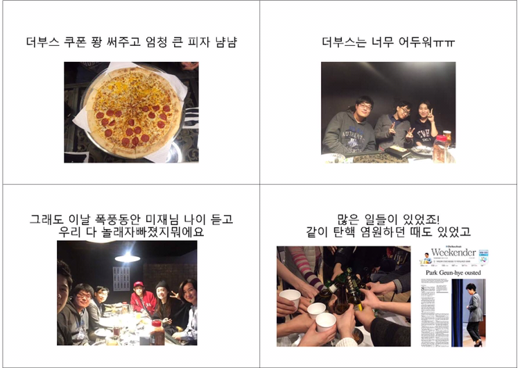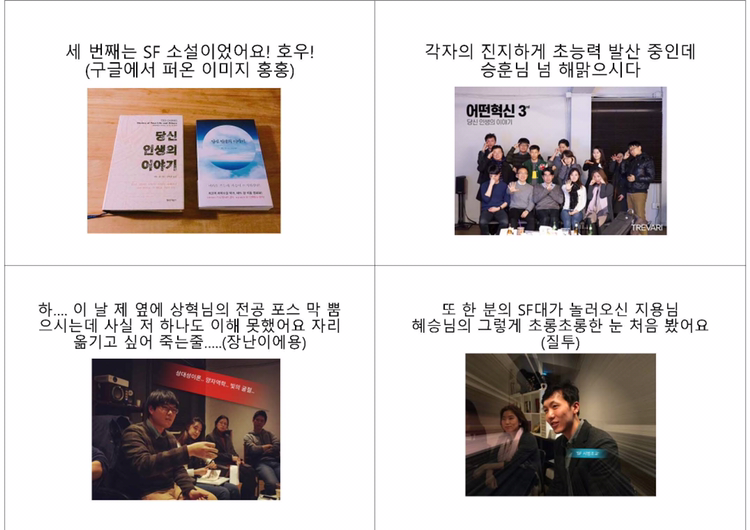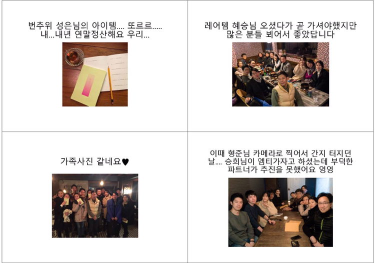 한 달에 한 번 진하게 토론하며 만나는 사이. 언제나 더 많이 배우는 느낌인데, 이번에는 요런 마음까지 받아갑니다. 고마워요ㅎㅎ 맨날 바쁜척, 번개도 거의 못 가서 죄송한데 '레어템'이라 지적해주신 것도 담아둘께요.. ㅋ PT를 묶음 짤로 만들어주신 형준님에게도 감사!!