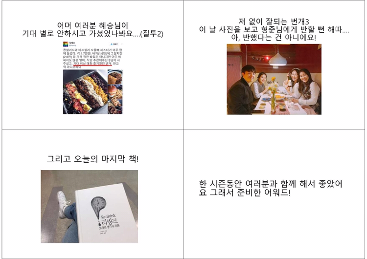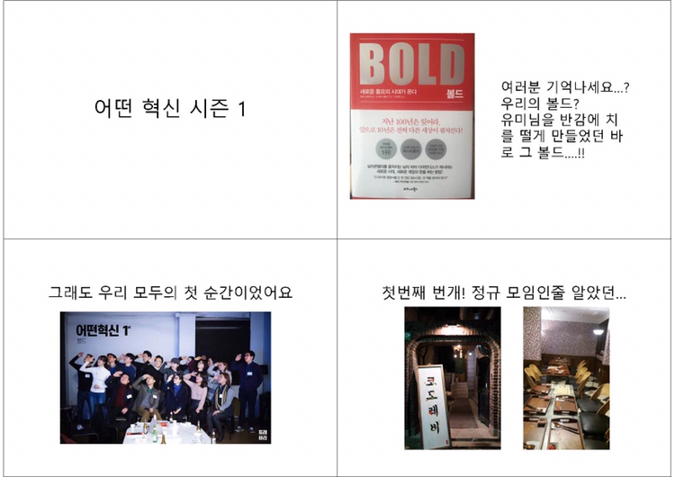 지난주 목요일 <어떤 혁신> 시즌1 마감하는 마지막 날. 클럽 파트너 이상은님이 이런 PT를 준비해왔습니다. 파트너는 각 클럽이 잘 굴러갈 수 있도록 모든 일을 챙겨주시는 비상근 총무 같은 분인데요.. 세상에나..