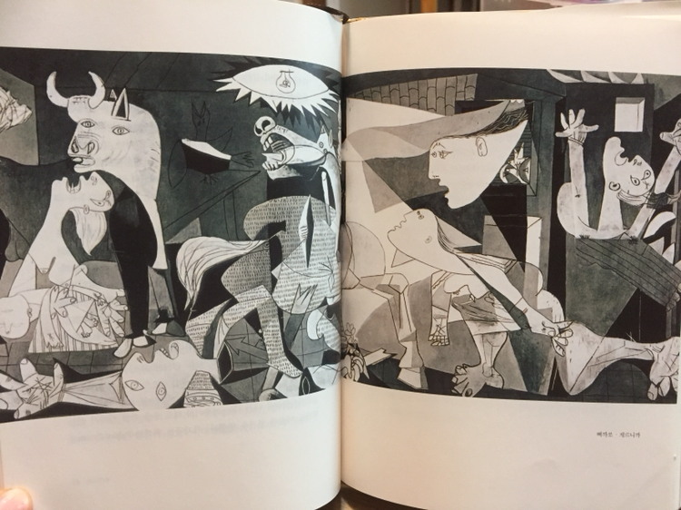 삐까쏘의 말을 옮겨보면 “스페인의 전쟁은 인민과 자유에 대한 반동의 전쟁이다. 나의 전 예술적 생애는 오직 예술의 죽음과 반동에 대한 싸움뿐이었다.. 스페인을 공포와 죽음의 바다에 잠기게 한 군사력에 대한 나의 공포감을 확실하게 표현하고 있다”고. 1937년 4월26일 나찌스 독일 공군은 독재자 프랑꼬를 지원하기 위해 바스끄 지방 소도시 게르니까에 무차별 폭격을 감행, 수백명을 학살했다. 희생자가 2000명을 넘는다는 설도 있다고 한다.. 이 그림을 소개하는 이야기에는 일본의 한 전쟁터 그림이 있다. 어떠한 고통, 분노, 좌절도 보이지 않는 평화로운 전장.. 예술의 출발선, 존재 이유를 생각하게 되는 그림들.