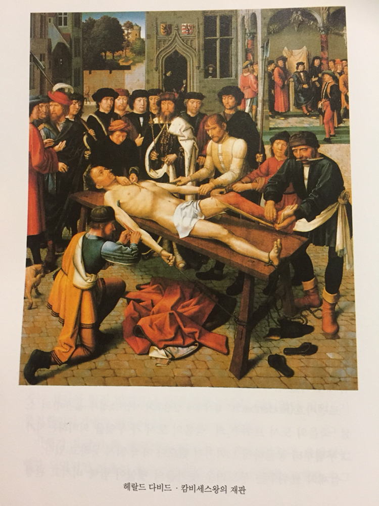 한순간 이 순례를 시작하게 만든 그림은 벨기에 미술관에 있었단다. 기원전 6세기 페르시아를 배경으로 가죽벗김을 당하는 희생자를 저토록 정밀하게 묘사하다니. “벗겨지는 살껍질의 주름살과 그 밑에 드러나는 근육의 부풀어오른 혈관 따위를 묘사하는 데 17세게 플랑드르 사실화..의 집요함”..