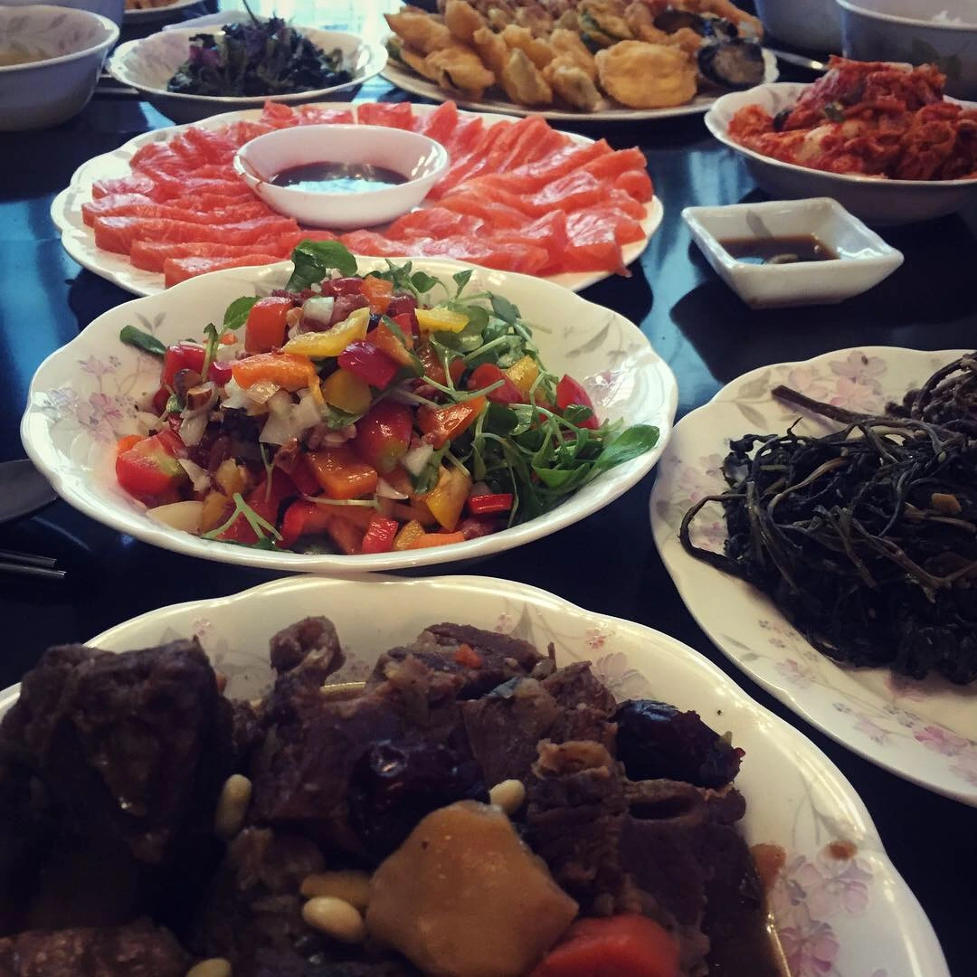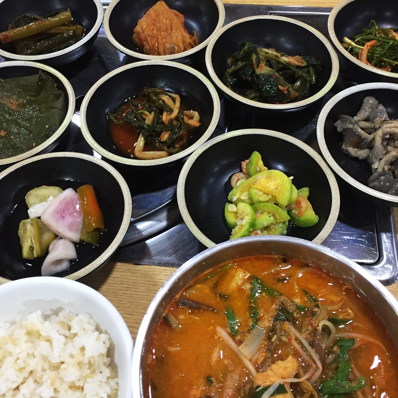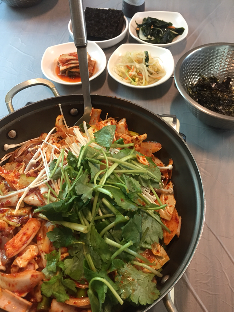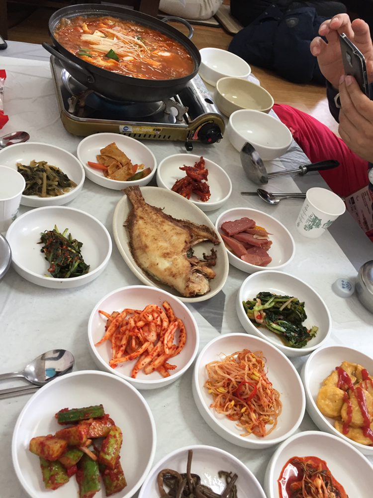 11. 평창 조직위 분들은 가성비 좋은 맛집 정도는 평정하셨더군요. 손만두 들어간 기막힌 김치찌개가 메인이라는데 반찬이 가자미구이에 고사리나물 달래나물 콩나물 시레기, 부추김치, 오이무침, 황태조림, 조림 햄볶음에 너겟까지. 수제 식혜와 드립커피도 주는데 7000원! 기막힌 낙지볶음에 김가루 참기름 슥슥 비비는 밥은 9000원 #대관령양떼식당 #길손 #평창맛집