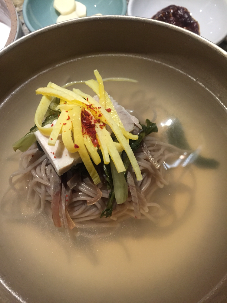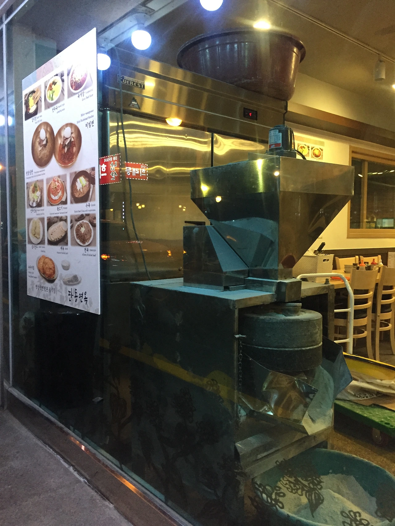 39. 일요일 근무가 늦어지면서 어디서 끼니를 해결할 것인지 아주 잠깐 고민했습니다. 둘째 데리러 가야하는데, 사무실에서 컵라면 할까 하다가 귀담아 둔 대치동 평양냉면 집에 가보기로 작심했어요. 둘째가 평냉 싫다고 해서 아쉽던 차에 이런 기회가 흔치 않잖아요. 결과적으로 S 추천대로 흡족. 직접 메밀을 제분하는 장면도, 실제 메밀도 처음 구경했고요. 9시 다 되어 도착한 유일한 손님에게 뜨끈하게 바로 부쳐준 부침개도 훌륭. 한 장 5000원인데 맛만 보고 싸들고 가기로. 배 부른데 작은 행복. #판동면옥 #아이들은_언제쯤_평냉맛을