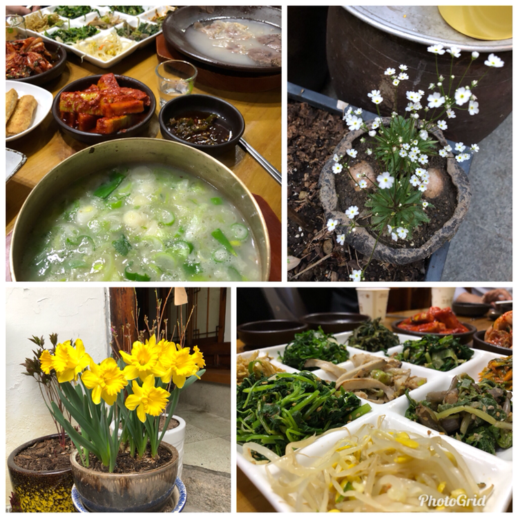 S가 찍어 함께 보내준 예쁜 꽃들도 한옥 마당 화분들에 옹기종기. 마당이 있어도 화분에 심는 이유는 알다가도 모르겠어요. #고래 #통의동곰탕 #힘내세요 #역사적순간들 #봄나물은_옳아요 #내일도_격무일까 #홀로야근하다말고