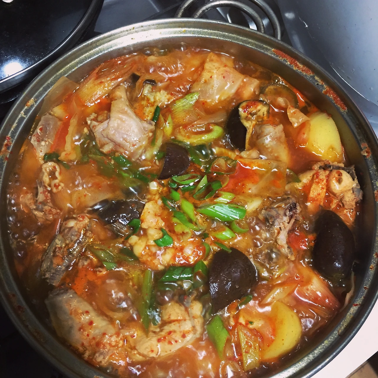 42. 집 덥다는 아이와 불 앞에 가기 싫은 나까지 주말마다 외식만 하다가, 드디어 집밥 계절 시작. 심지어 닭볶음탕을 팔팔 끓여냈습니다. 두 개 남은 가지는 하나 상해서 하나만 넣었고. 감자 양배추 등. 보통 소금 간만 하다가 오늘은 간만 고추장 고춧가루까지 동원. 모처럼 제대로 차린 집밥이라 찬밥 대신 밥도 새로 짓고. #요리는_마음의_평화 #저녁은_또_나가자는데