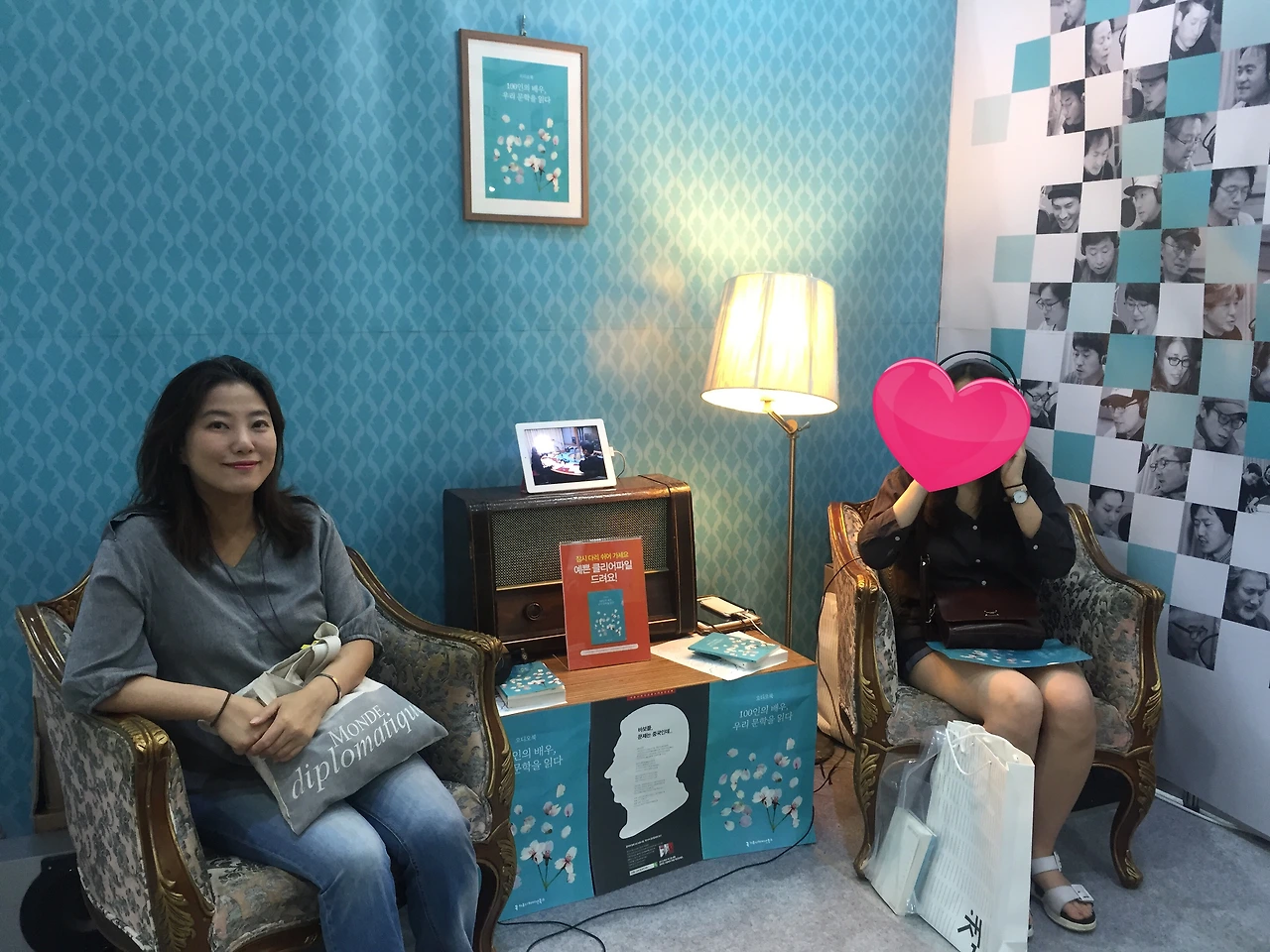 친절한 L님 덕분에 헤매지 않았습니다. '커뮤니케이션북스'에서 헤드폰 끼고 예쁜 배경으로 찍어봅니다. 작년에 여사님도 도서전 오디오북 부스에서 찍으셨죠ㅎㅎ