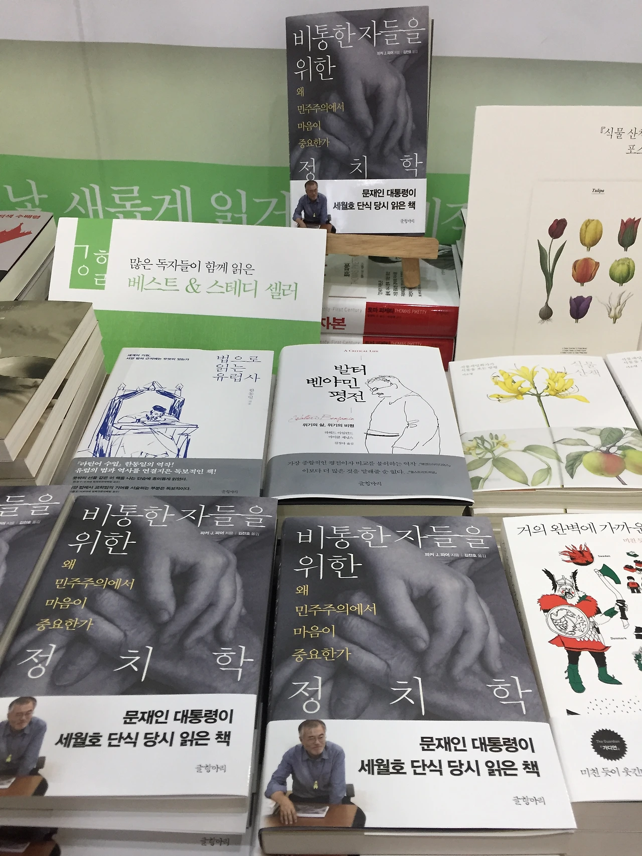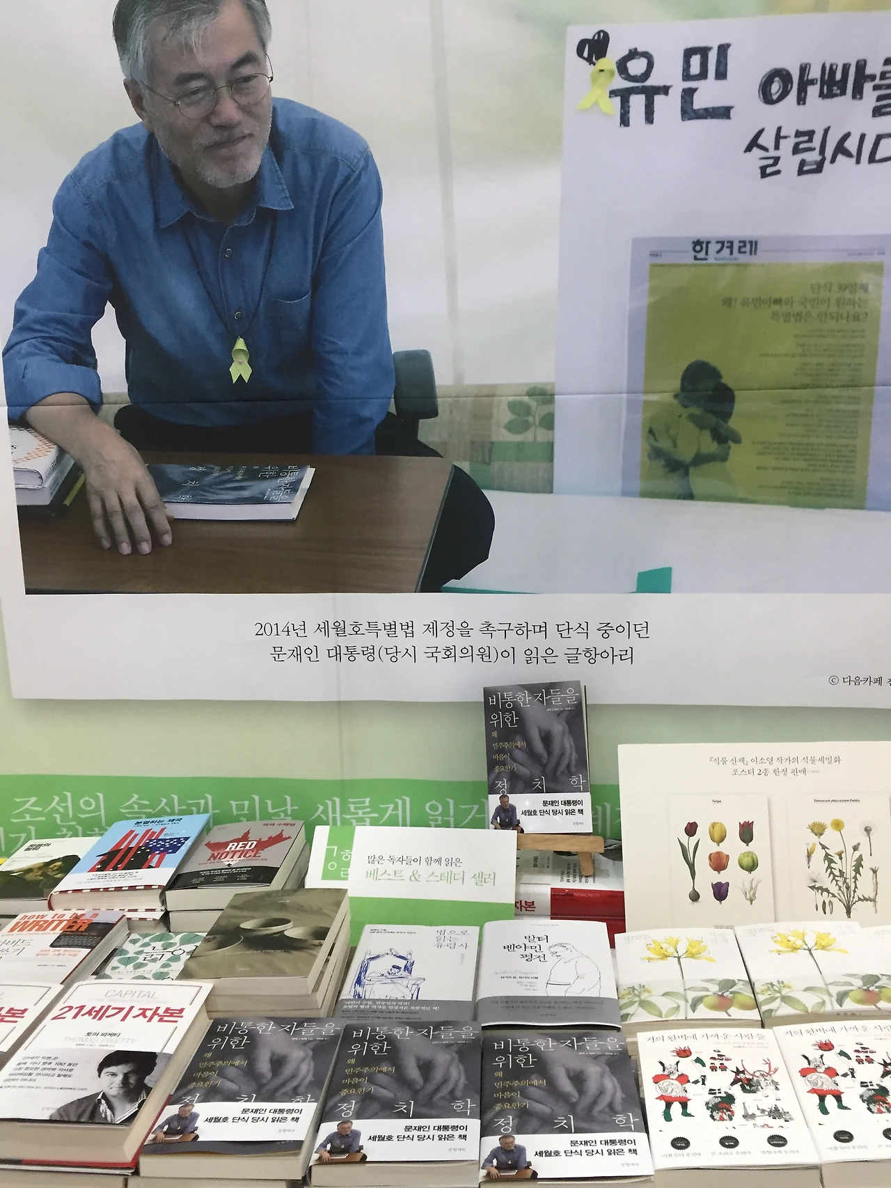 <비통한 자들을 위한 정치학>의 홍보 문구는 '문재인 대통령이 세월호 단식 당시 읽은 책'입니다. 사진도 크게 붙어있군요.