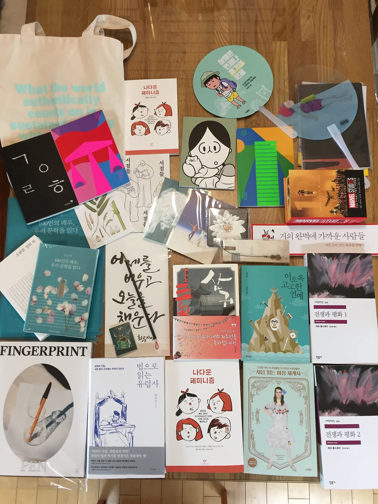 일단 구경합니다. 그리고 재빨리 책 사러 다닙니다. 입장권이 5000원인데, 5000원 할인쿠폰이라 책 사면 이득입니다. 어차피 10% 정도 할인은 널렸고, 각종 굿즈와 유아동 시리즈는 할인폭이 훨씬 큽니다. 딸은 <법으로 읽는 유럽사>, <처음 있는 여성 세계사>를 찜하고 돌아다녔는데, 중간에 헤어졌다가 만나고 보니 베니 열성팬 답게 마블 기념품과 <나다운 페미니즘>까지 샀더군요. 게다가 대통령님 연설 덕분에 단연 ’톨스토이‘가 화제잖아요. 그동안 그리 꼬셔도 안 보더니 이번엔 보겠다고 해서, <전쟁과 평화> 4권 중 2권을 일단 샀습니다. 딸 맘 바뀌기 전에 사긴 했는데, 어쩌자고 무겁게 오늘 다 샀을까. 행사장 전체에서 5만원 이상 구입하면 준다는 비매품 ’서점들‘도 챙기세요. 금방 넘깁니다ㅠ 그리고.. 지하철 타고 돌아오는데 무거워서 어깨 아파 힘들었어요. 펼쳐놓고 보니 좀 많군요ㅠ 나름 비싼 데이트. 그러나 흡족한 시간이었습니다. 예쁜 공짜 사은품, 기념품도 많아요. 내일까지입니다. (왜 제가 홍보를 하고 있나요.. 홍보가 몸에 배인...쿨럭)