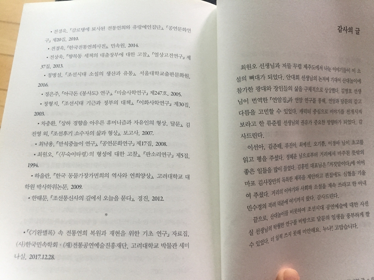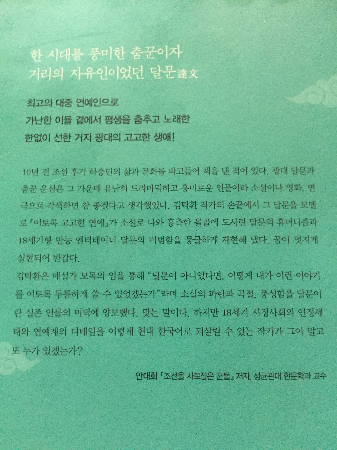 책 표지 뒤편에, 달문의 생을 이렇게 ‘18세기형 만능 엔터테이너’로 그려낸 작가에 대한 헌사가 있습니다. 광대 달문과 춤꾼 운심은 기록에 나오는 인물들입니다. 책 말미에는 참고 자료 목록이 나옵니다. 거저 받아먹고, 한 없이 좋은 사람을 만나 장편의 늪에 푹 빠져 설레는 시간을 보냈습니다. 고맙습니다.