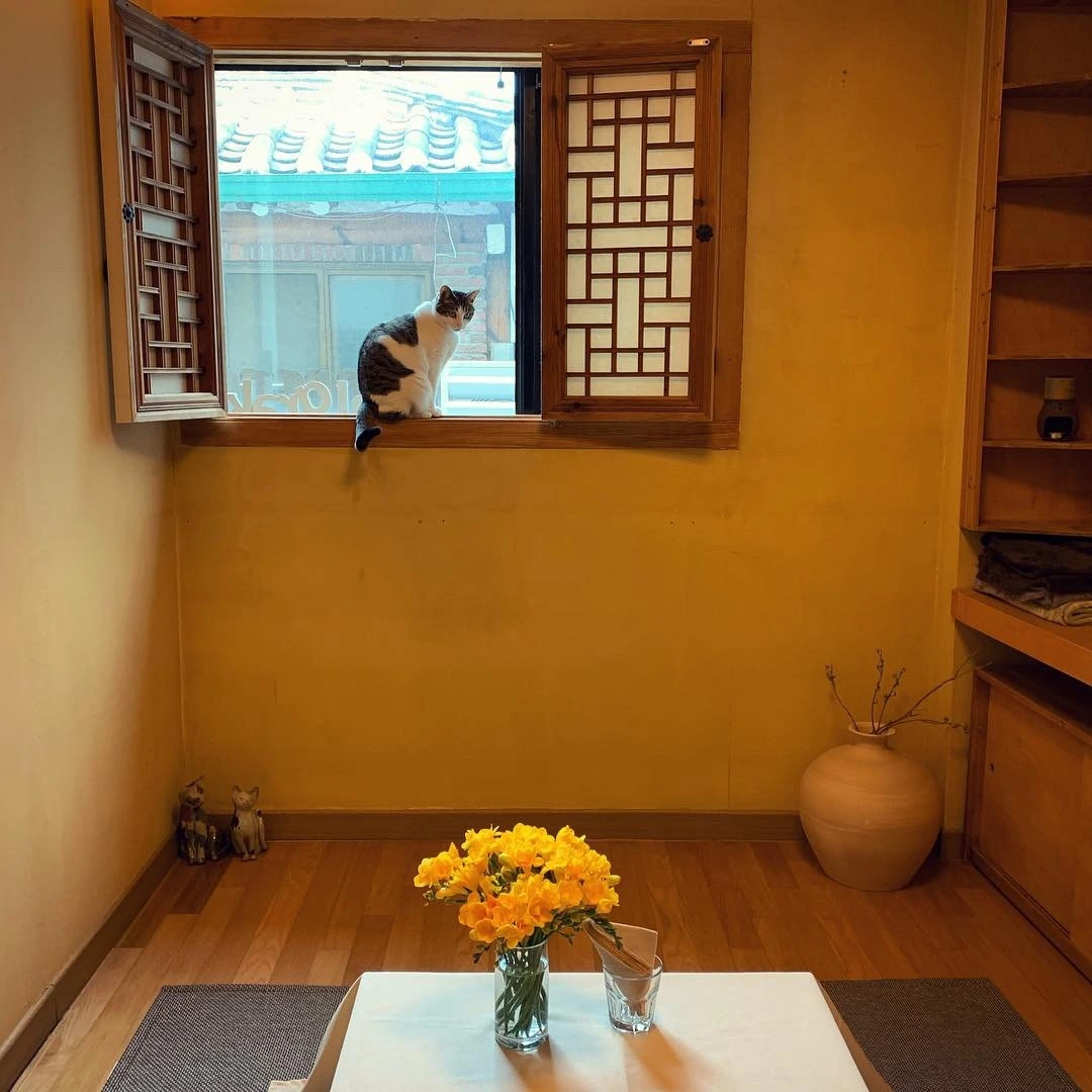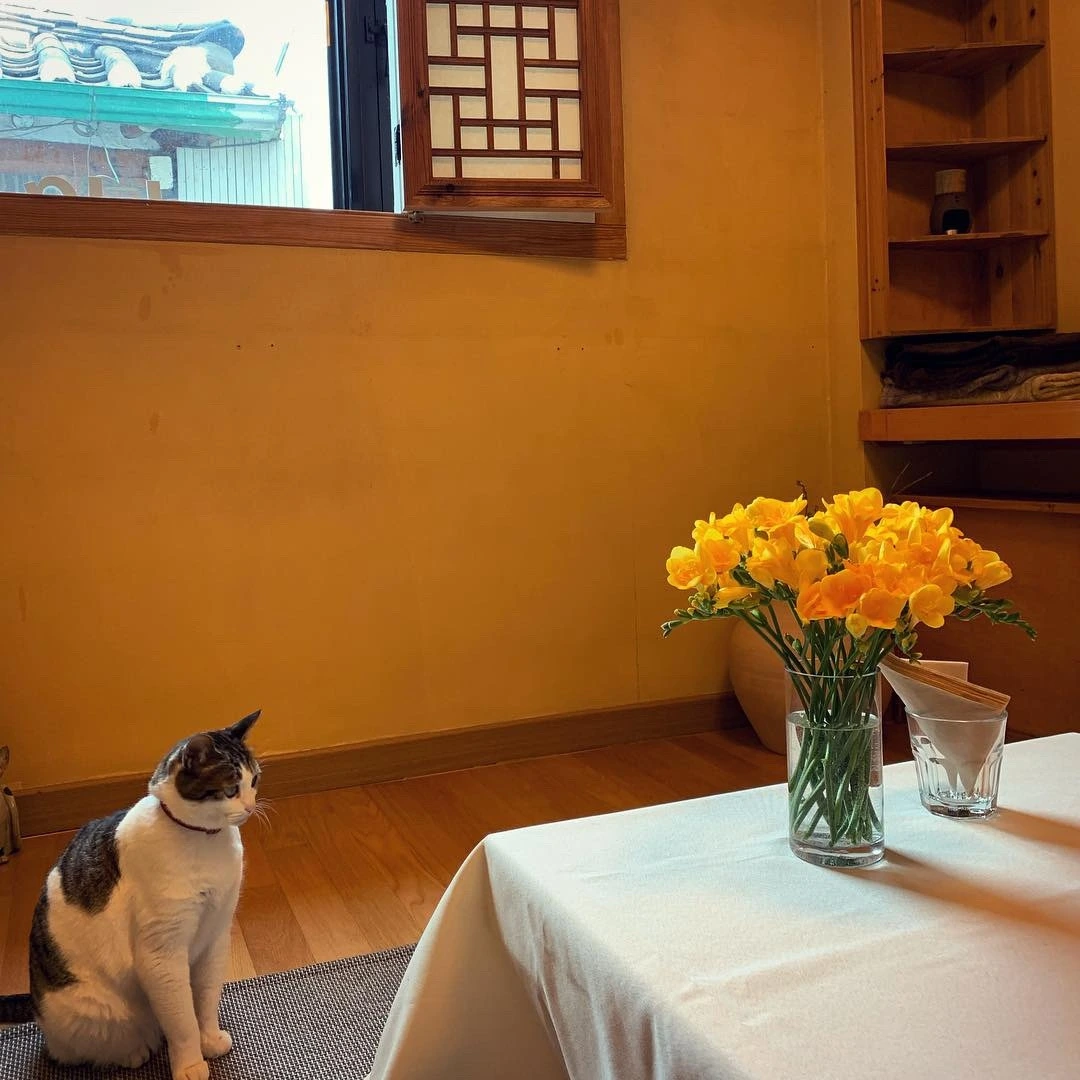 사간동 국수집에서 C님을 만난 그 날은 아직 쌀쌀했건만. 옆의 #달그락 찻집에서 봄을 처음 생각했던 거 같아요. 작은 한옥 창으로 햇살은 어쩐지 따스했고. 창틀에 앉아 있던 방 주인 고양이는 우아한 몸짓으로 탁상 아래 자리를 잡고 갸르릉.