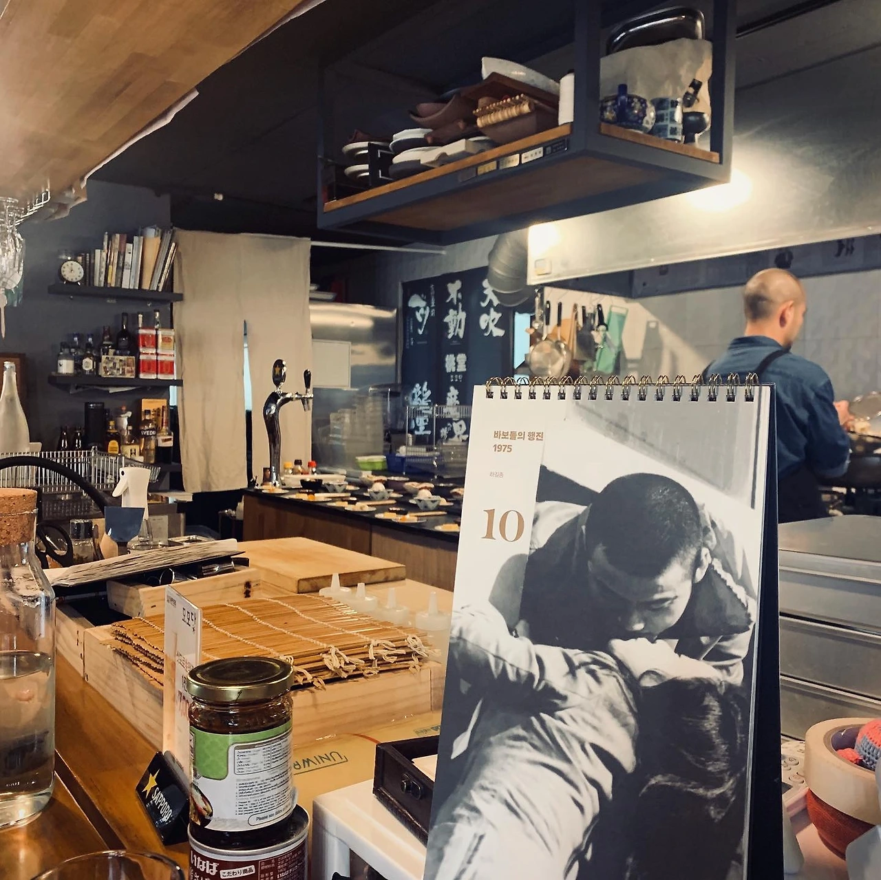 109. 오래된 후배들과 상암동 #모모랑. 달력에 마침 #바보들의행진 사진이 눈길