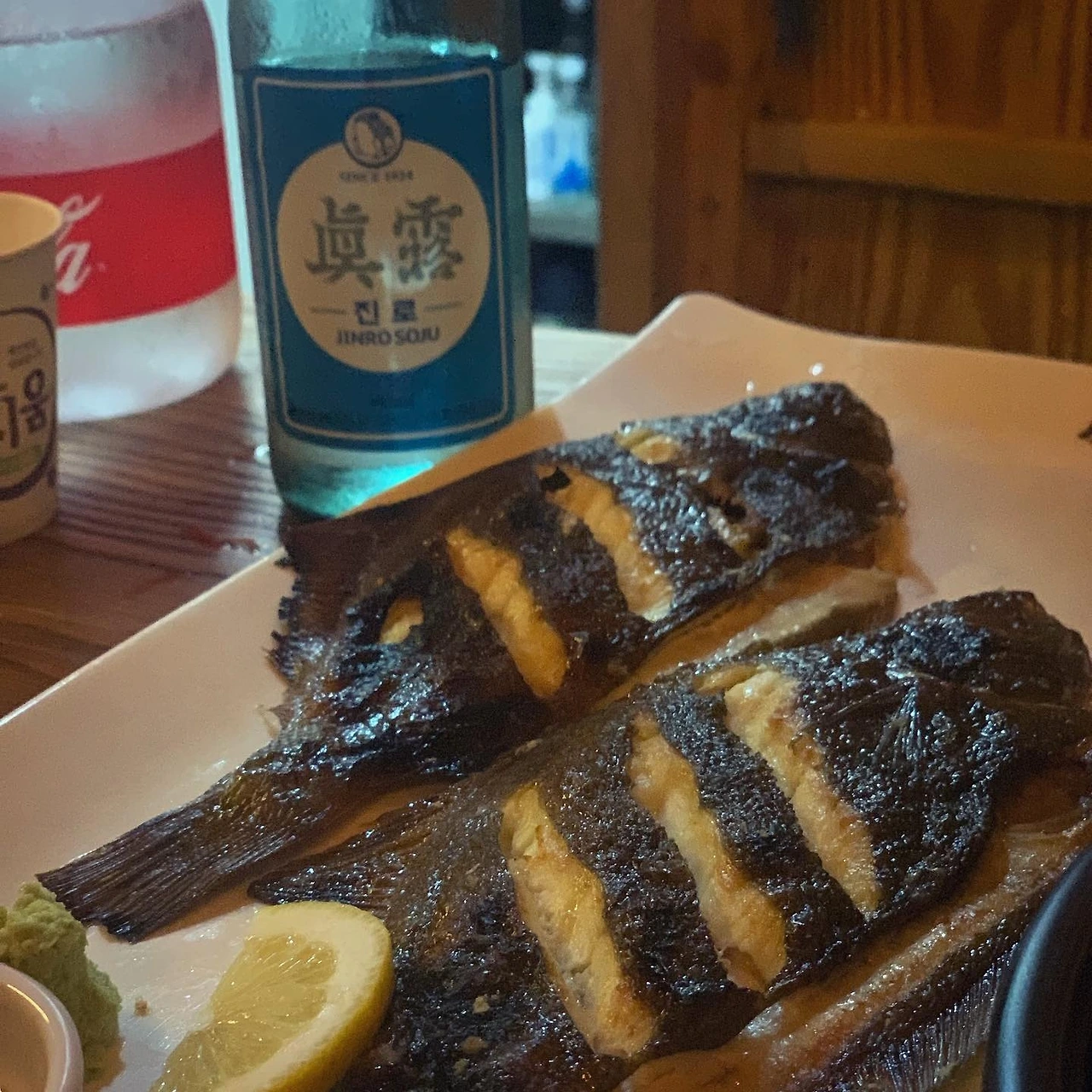 92. 도산공원 인근 #더청춘 셋이서 2차로 만나 1시간반 딱 세 병. 가지런한 가자미 구이에 #백투더진로 망했다 슬프다 하는 님에게 필요한게 정말 오직 술일까요. 그거라도 일단. 계속 응원하면서 이민 못가게 막을래요.