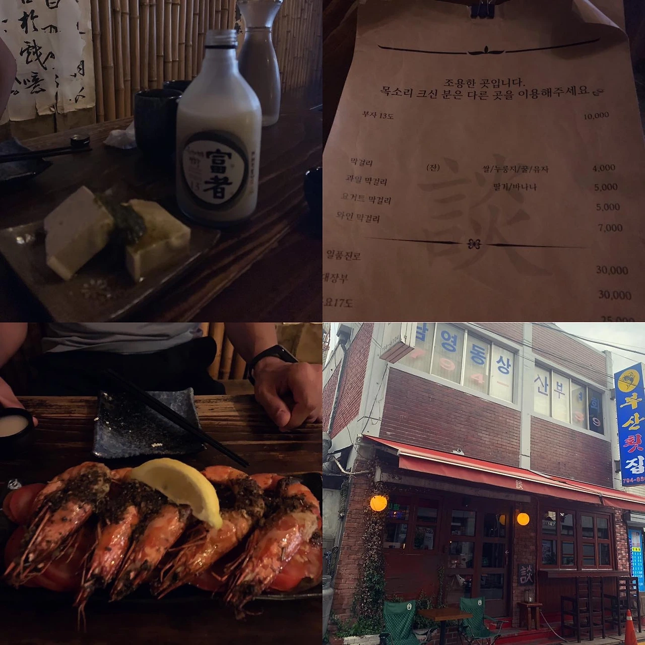 74. 호기롭게 마신 날의 기록. #오리올 야경은 마법에 빠진 시간을 만들어줍니다. 그냥 별 것 없이 좋아요. 지지고볶은 인연이 이어지겠죠. 이날 1차는 숙대입구역 #막걸리담 메뉴판에 “조용한 곳”이라며 목소리 큰 사람은 다른데 가라고 합니다. 실제 조용해요ㅎㅎ 메뉴 가성비 굿. 생 막걸리 달달시원해요. 지도에 안뜨는집이라 옆집인 부산횟집 찍고 가면 좋아요.