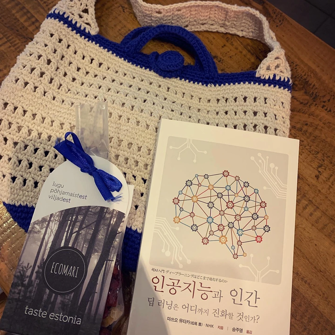 85. 손뜨개 가방이 예쁘다고 지나가며 한마디 했을 뿐인데, H온니가 며칠 뒤 제게 그냥 주셨어요. #안녕인간 책모임 전에 급히 읽고 싶었던 따끈신간 #인공지능과_인간, 물건너 온 간식까지. 동생 분이 직접 떠주신 백이 제가 쓰기엔 넘 깜찍하고 귀엽지만 잘 써볼게요. 함께 아보카도 타르틴과 샐러드, 빵을 나눠 먹으며 따뜻하고 진지한 대화까지 흡족한 여의도 점심나들이. 평일에 느긋하게 거기까지 가서 밥 먹고 수다떠는게 꿈만 같더라고요.