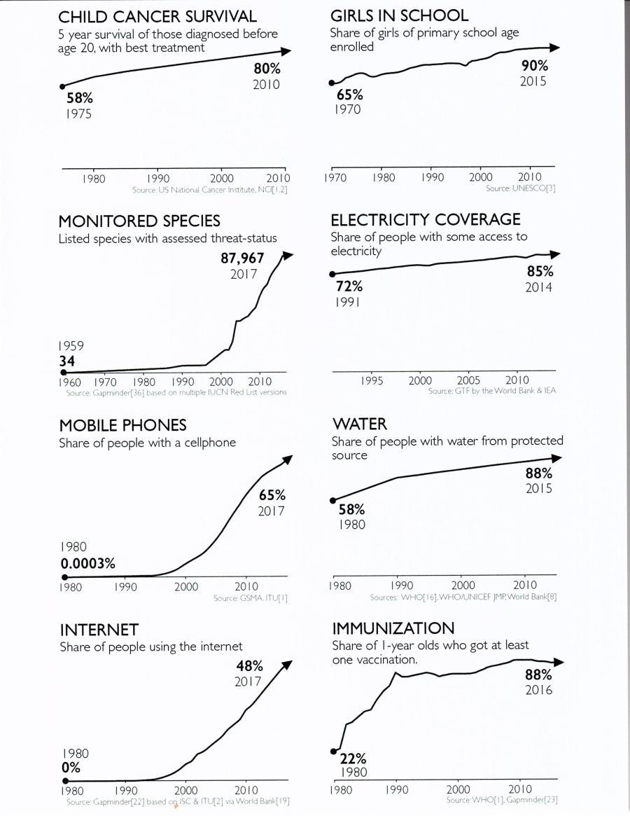 “예방접종 받는 아이 88%, 전기 공급 비율 85%. 초등학교 나온 여자아이 비율 90%. 자선단체와 언론이 자극적 숫자와 고통받는 개인 모습을 보여주다보니, 왜곡된 시각으로 세계를 인식하고, 발전을 체계적으로 과소평가” (183쪽)