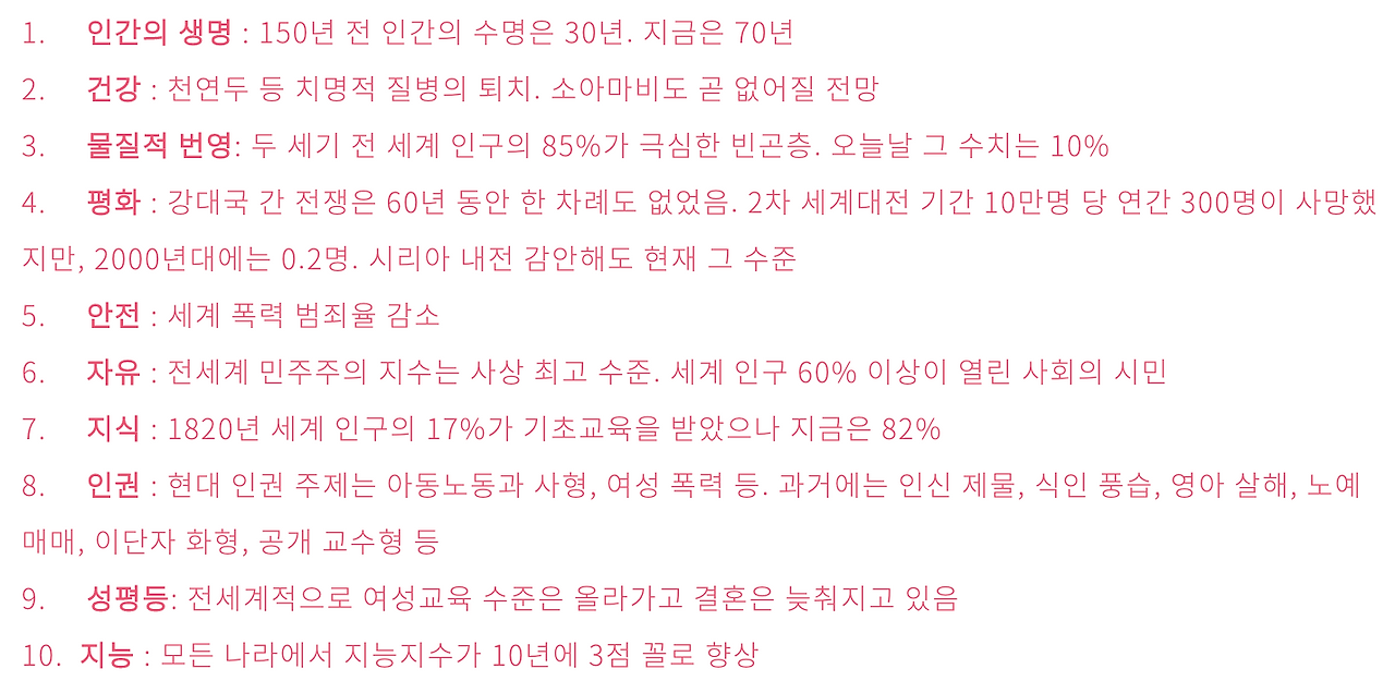 "인류 역사상 강대국 간에 이렇게 긴 평화가 이어진 적은 없었다. 오늘날 갈등과 그로 인한 사망자는 그 어느 때보다 적다." (161쪽)