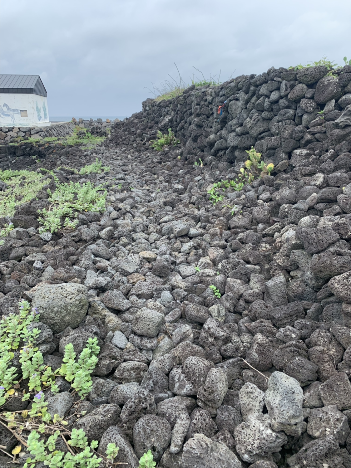 올레14길은 온통 돌길이라 힘들었어요. 길이 없어지나 싶을 때 마다 올레 리본이 등장해서 얼마나 고마웠는지 몰라요. 저 길로 가야하나 싶을 때 돌벽에서 인사하는 리본들. 물론 제가 있는 위치 기준으로 올레길을 세세히 보여주는 카카오맵 도움을 엄청 받았습니다.