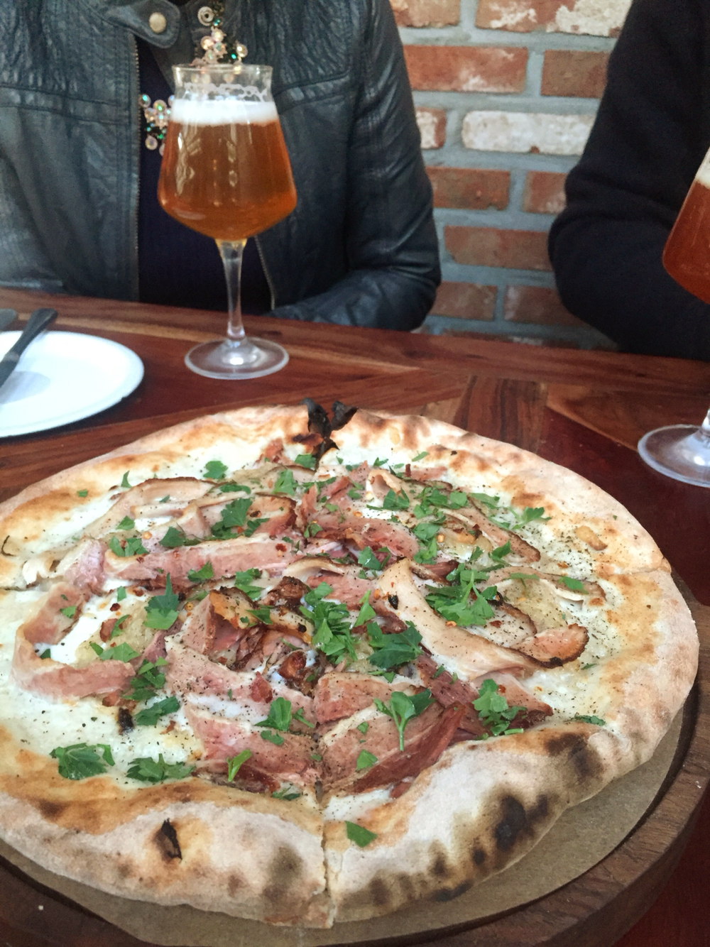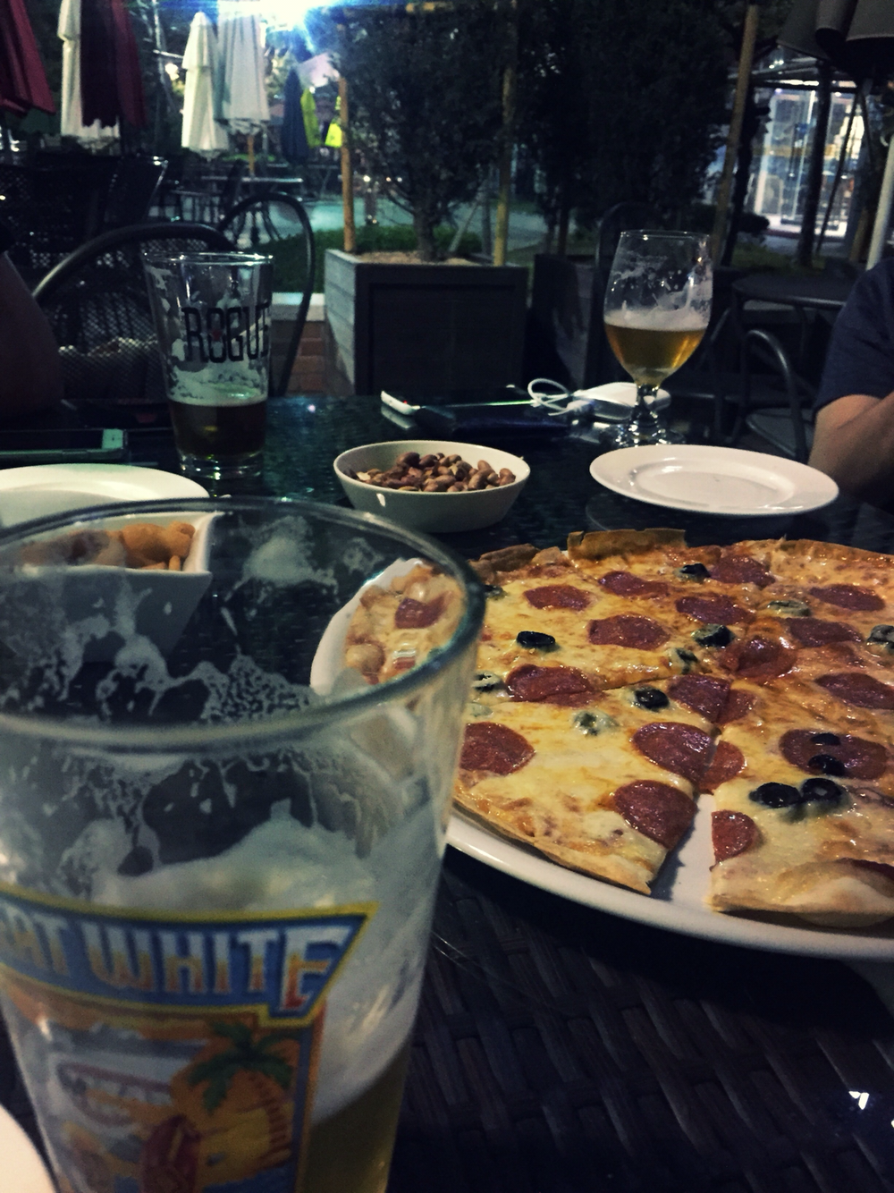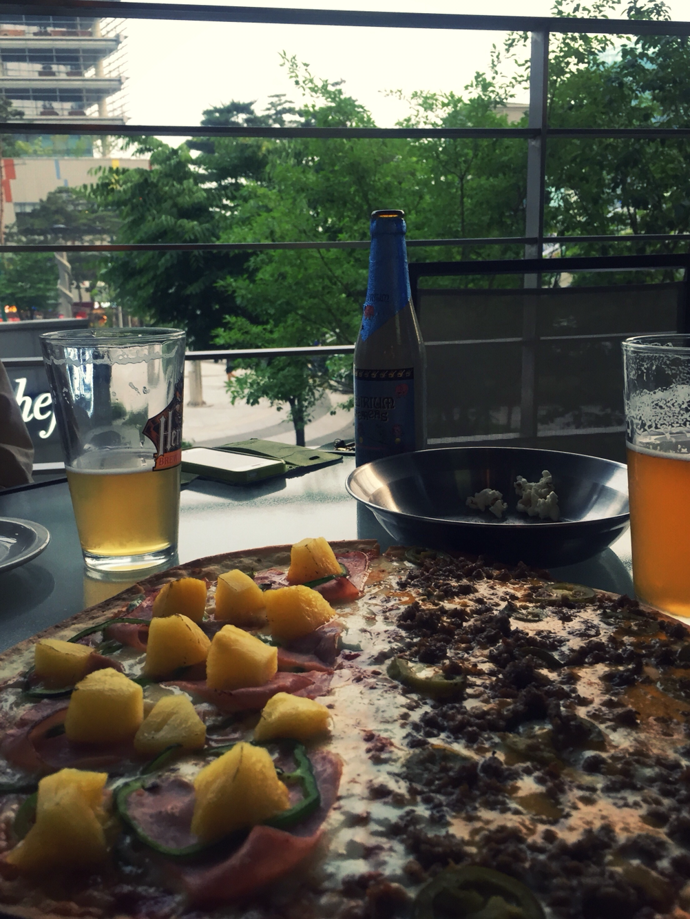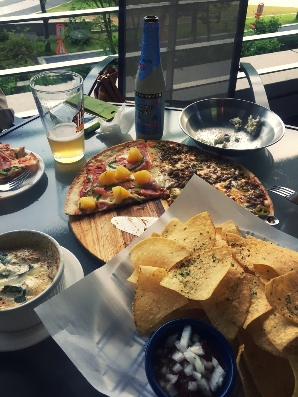 54. 누군가 판교 최고의 피맥집이라 했는데. 할라피뇨 피자, 매콤하고 진한 맛. 뜨거울 땐 정말 괜찮다. 더구나 테라스 자리가 좋은 계절. I는 내게 약속 없으면 못 견디는 불안장애가 있다고 주장중. 판교 브루클린