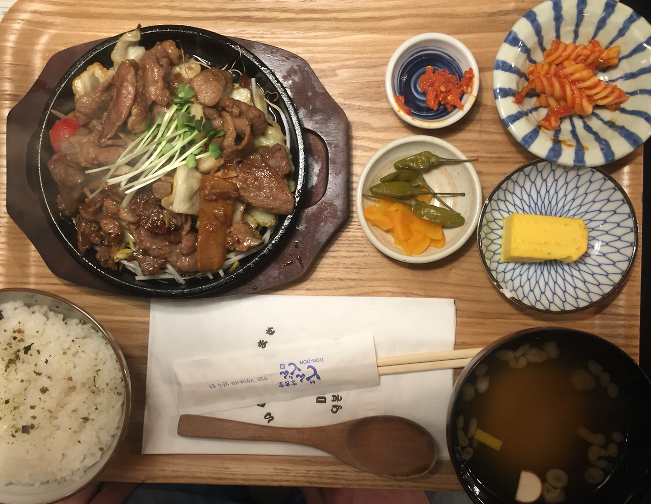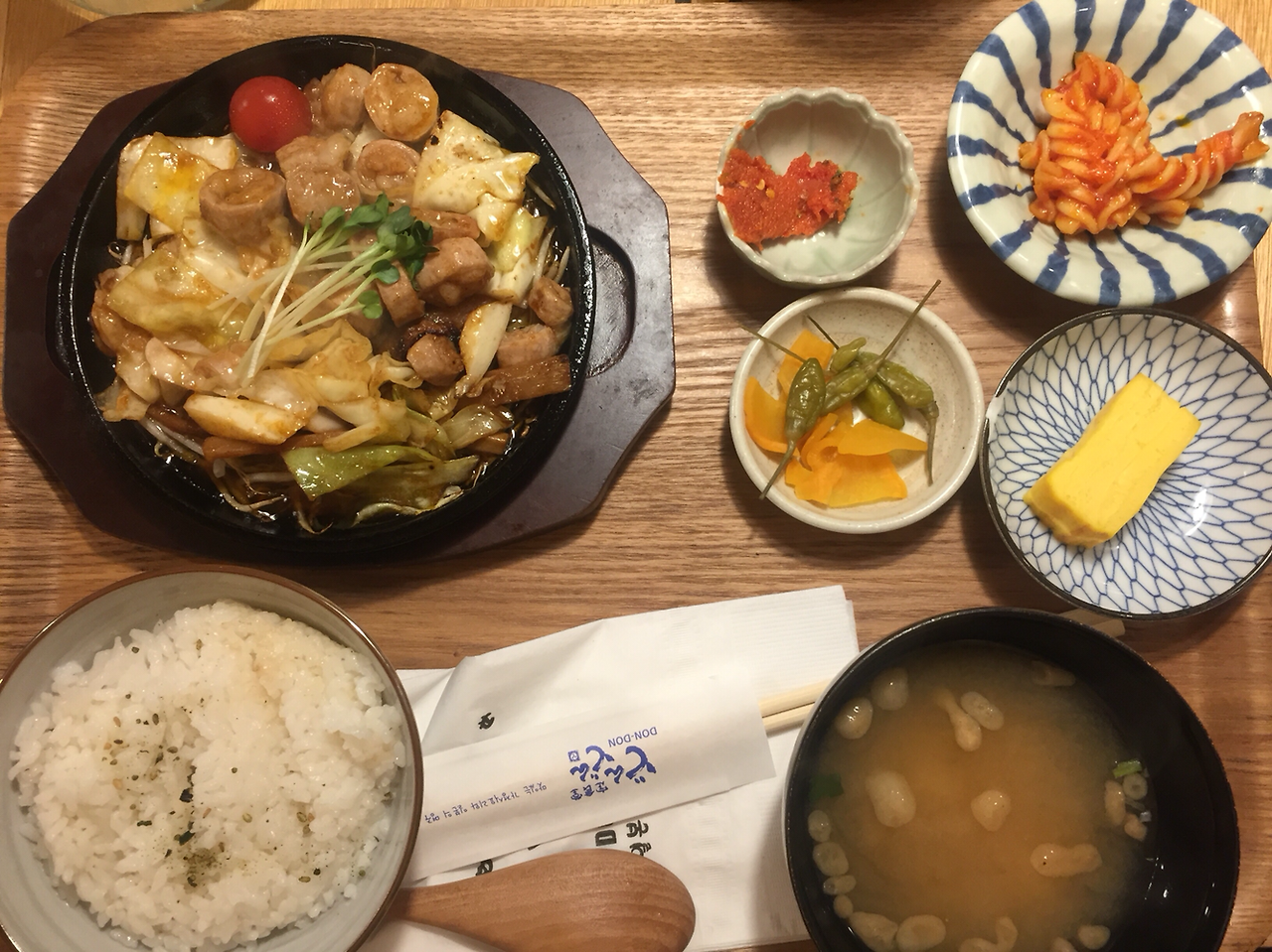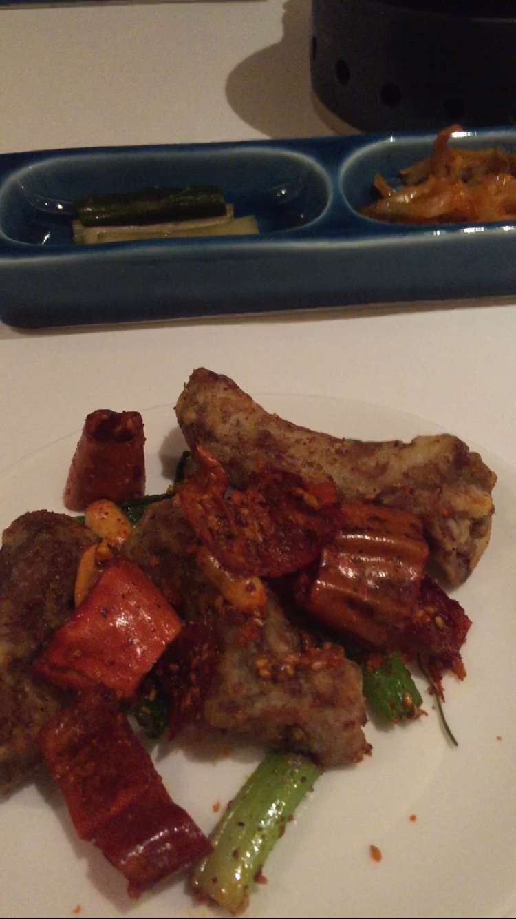25. 평일 저녁 옆지기와 외식이 대체 얼마만인지. 서로 바쁘다고 너무 쿨하고 무심했나. 일본 가정식이라는데 명란젓 반찬에 후리가케도. 간장맛 생강소스의 돼지고기 볶음은 괜찮지만 곱창볶음은 질겼고 무맛. 강남역 돈돈