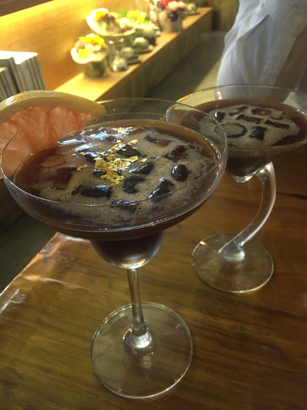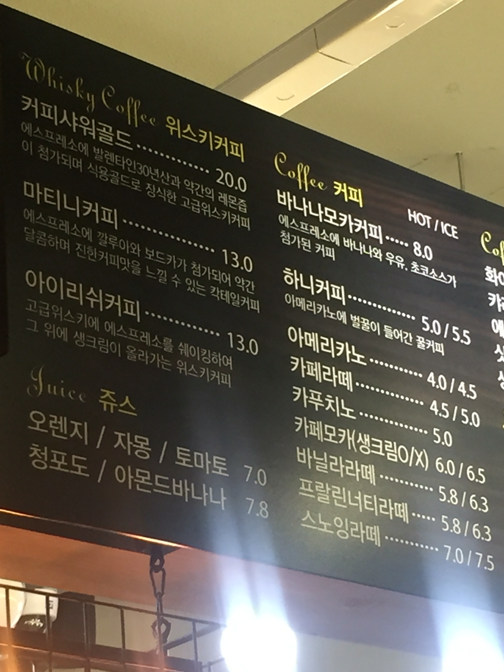 49. 에스프레소에 발렌타인 30년산과 약간의 레몬즙, 식용 금가루가 들어간 고급위스키커피라고. 무려 2만원 커피샤워골드. 대체 얼마나 들어갔는지 모르겠는데 맛은 신기함. 사진 뒤는 마티니커피. 압구정역 모카마티니
