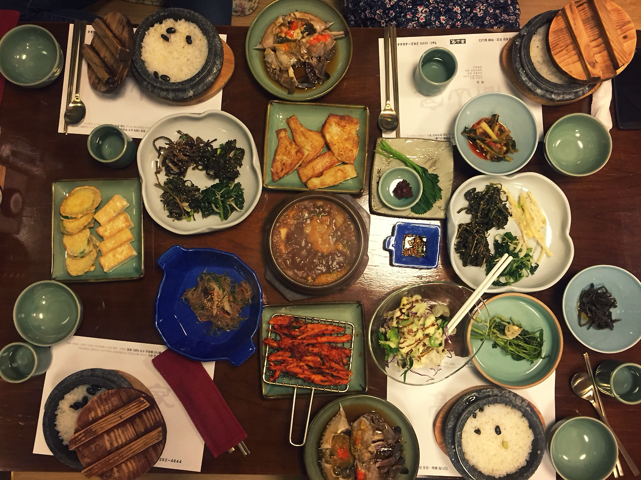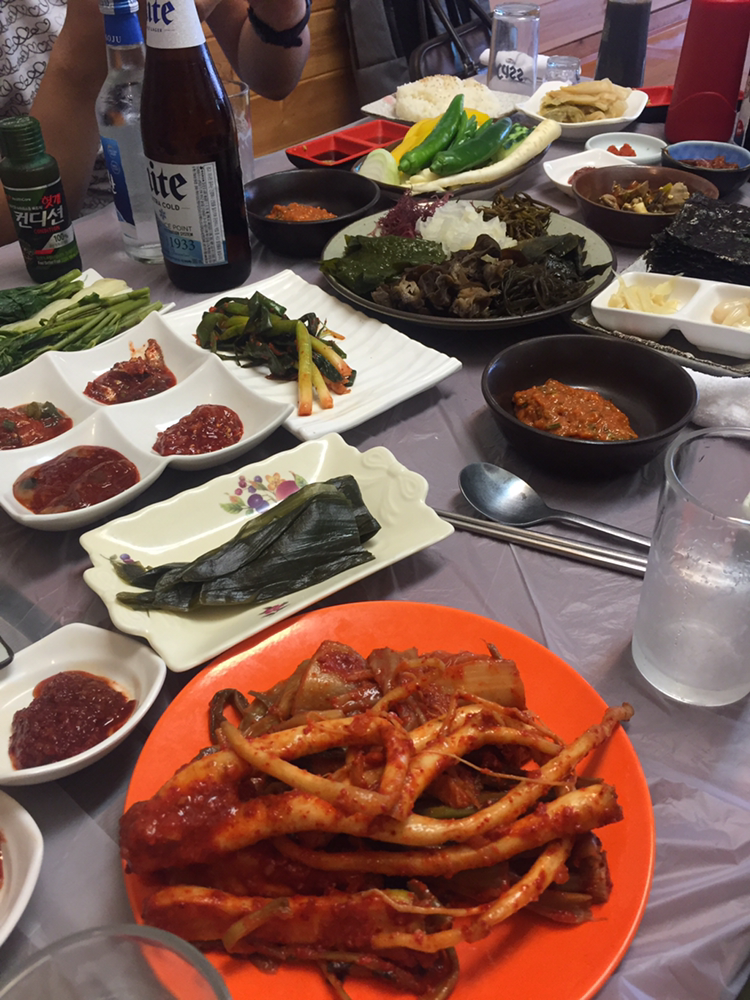 45. 얼마전 춘천 나들이. 점심은 유포리 막국수. 일행들의 행복한 반응에 괜히 흐뭇. 동치미 새삼 좋았다. 저녁은 인근서 채취한 열두 가지 나물이 계속 리필됐다. 더덕구이 정식과 간장게장 정식을 섞어 주문. 고산가