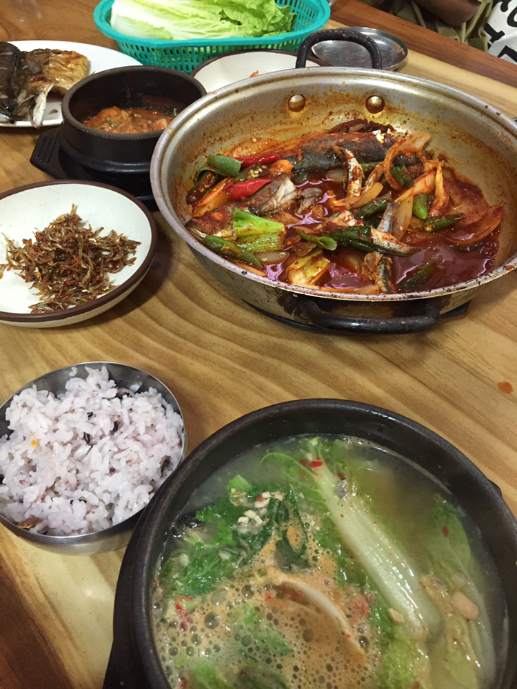 61. 전갱이 통째로 끓여주는 각재기국은 돌하르방 식당이 최고지만 공사중이라고. 대신 이 집은 각재기국에 더해 멜조림, 각재기조림을 곁들일 수 있고 더 넓다. 고등어 구이도 주문할까 했더니 서비스. 제주시 앞뱅디식당