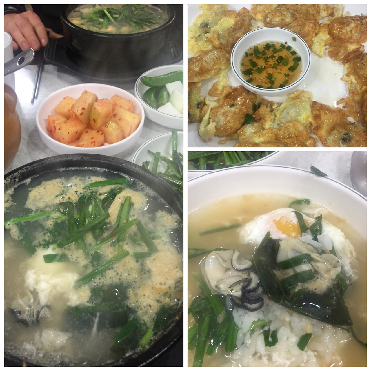 15. 부추 더 달라고 해서 듬뿍 넣으라는 K님 조언. 뜨거워서 덜어 먹는다. 탱글하고 신선한 굴. 초미니 계란 풀으니 좋아하는 그 맛. 1.5만원 굴전도 뜨끈뜨끈. 점심에 줄 서는 집. 삼성타운뒤 김명자 굴국밥