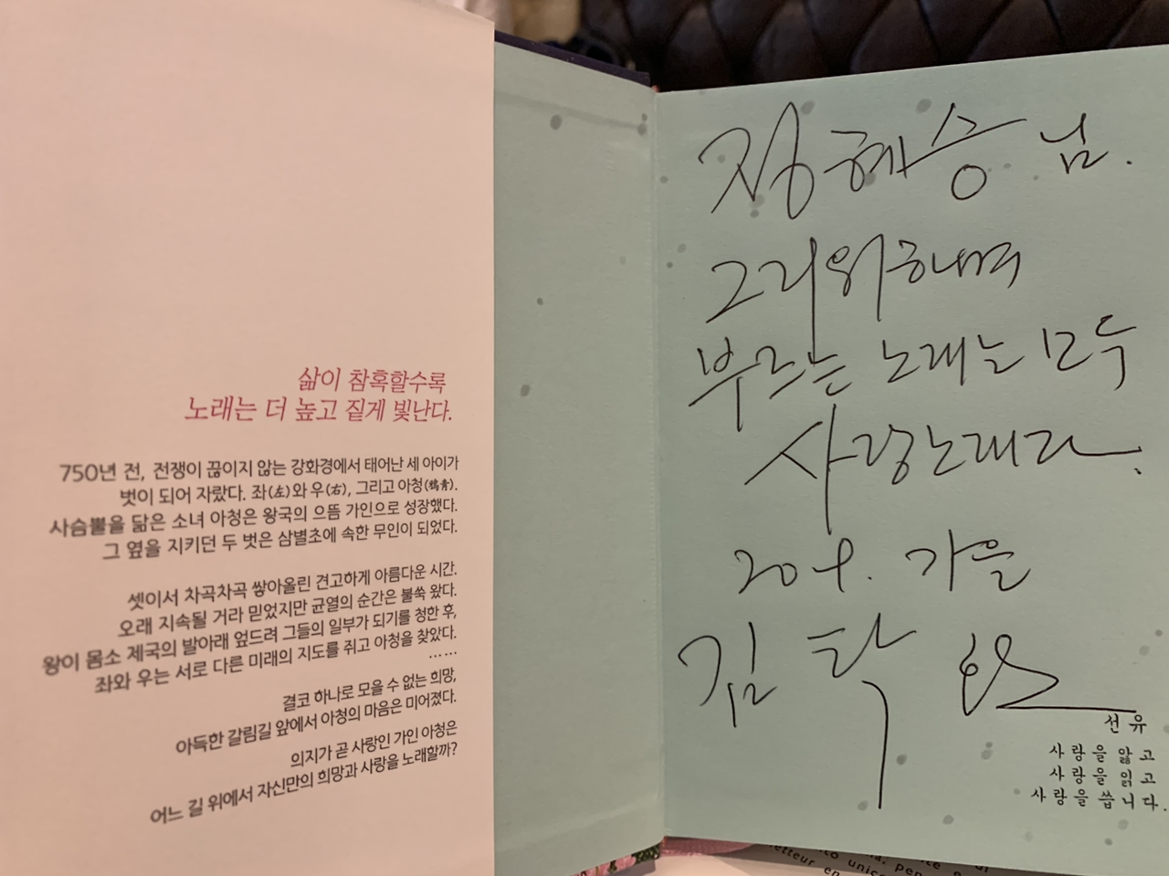 인간은 사랑하기 위해, 그 사랑을 기억하기 위해 태어난다고 하셨죠. 그 사랑을 오래 남기는 것도 결국 기록입니다. 노래입니다. 노래가 사람을 움직이고, 시대를 좌우합니다. '서경별곡', '가시리', '정석가', '청산별곡', '한림별곡'을 지나 '만전춘별사'까지 아청이 부르는 노래가 몇 백 년을 훌쩍 뛰어넘습니다. 조국의 운명과 함께 해버린 평범한 개인의 사랑노래가 세월을 건너 사람들의 마음을 흔듭니다. 이렇게 작가의 손을 통해 다시 살아납니다.