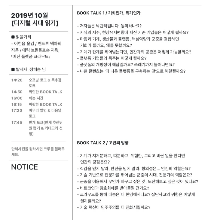 이 책은 #트레바리 #국경 클럽에서도 읽고, #트레바리 #디지털시대읽기 클럽에서도 함께 읽었습니다. 두 차례나 토론을 했더니, 아주 유익했어요. 그래도 각자 일터에서, 관심사에서 머신과 플랫폼을 어떻게 바라보고 있는지, 어떤 사례가 있는지 다 다르더라고요. 이런게 토론의 맛이죠.