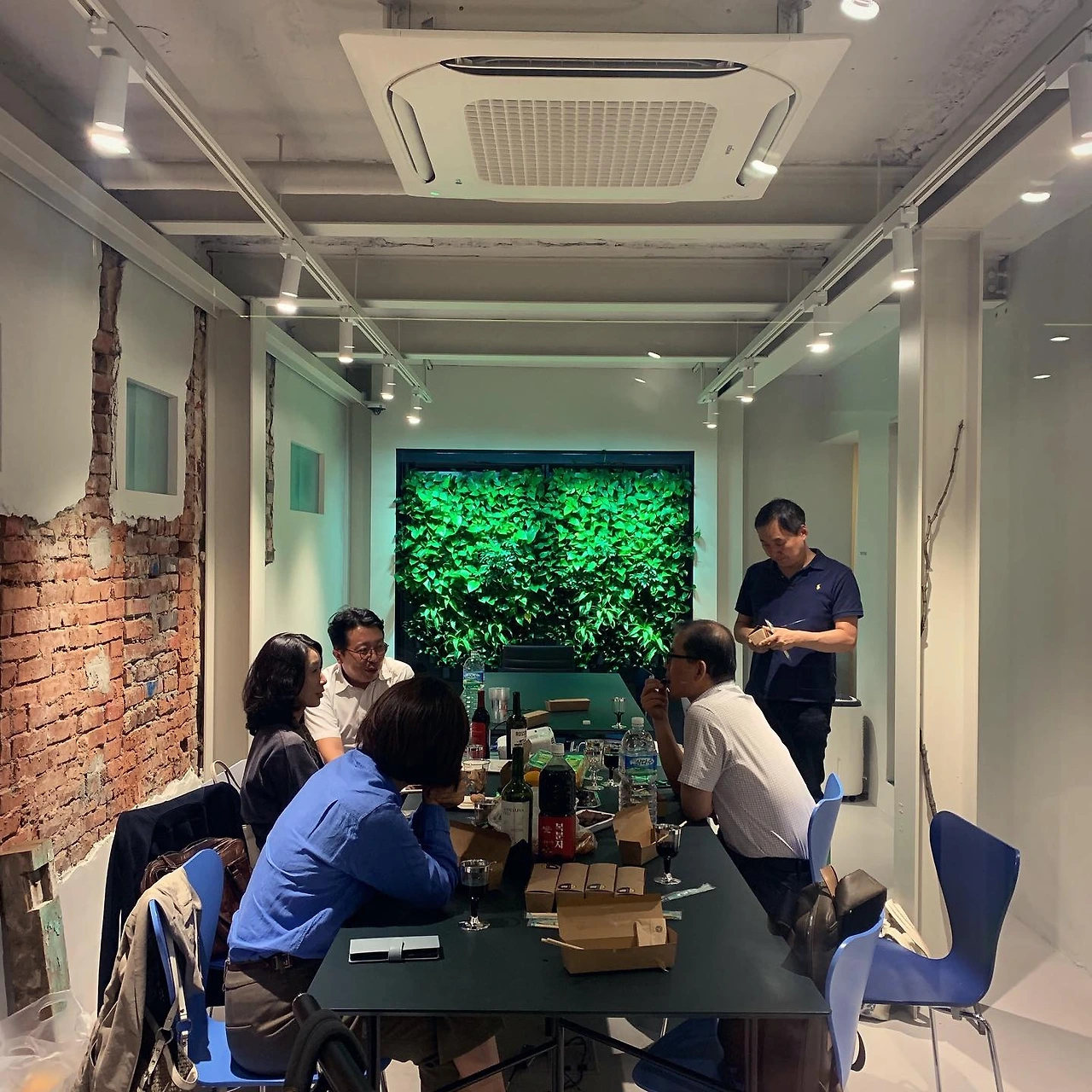 핀란드 NAAVA 사의 그린월을 찾아내 식물 벽을 만드셨더군요. 유해물질과 미세먼지를 걸러주는 역할을 한다고 합니다. 더듬이 같은 안테나 통해 NAVAA 경기도 사무실에서 직접 공기질과 물 주는 시간 등을 관리한다고요. 공간의 핵심은 조명. 눈이 편하도록 직간접 조명으로 조도를 맞췄고요. 덴마크 사람들은 직업을 구해 돈을 벌면, 자신이 가장 오랜 시간을 보내는 의자부터 산다더니.. 저도 덴마크 프리츠한센 의자 오리지널에 앉아서 말씀 들었네요. 저야, 아는게 없는 분야지만, 딱딱하면서도 편안한 의자에 혹했습니다.