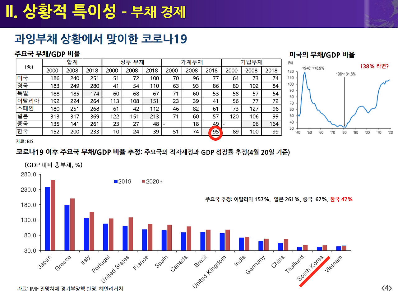 중요한 포인트는…시장 중심주의에서 국가로 사회 중심 축이 빠르게 이동하고, 큰 정부가 역할을 할 수 밖에 없다는 대목. 최근 독서모임에서도 계속 토론한게, 큰 정부로 가는거냐, 이 문제였는데 말임다. 경제적 양극화가 심해져서 국가가 역할을 해야한다는 겁니다. (그래프 보세요) 정책 한계 부딪치는데 GDP 대비 국가부채는 잘 봐야한답니다. 우리는 국가 재정 좋은 편이지만, 어느 나라나 정책을 무한정 쓸 수 있는 곳은 기축통화국 미국 뿐이라고요.