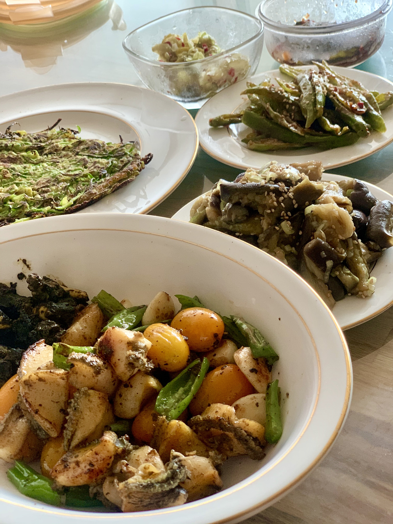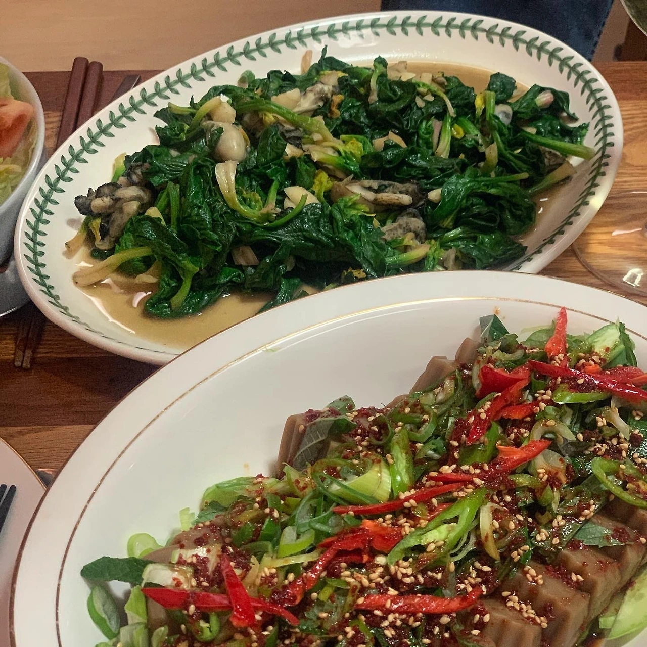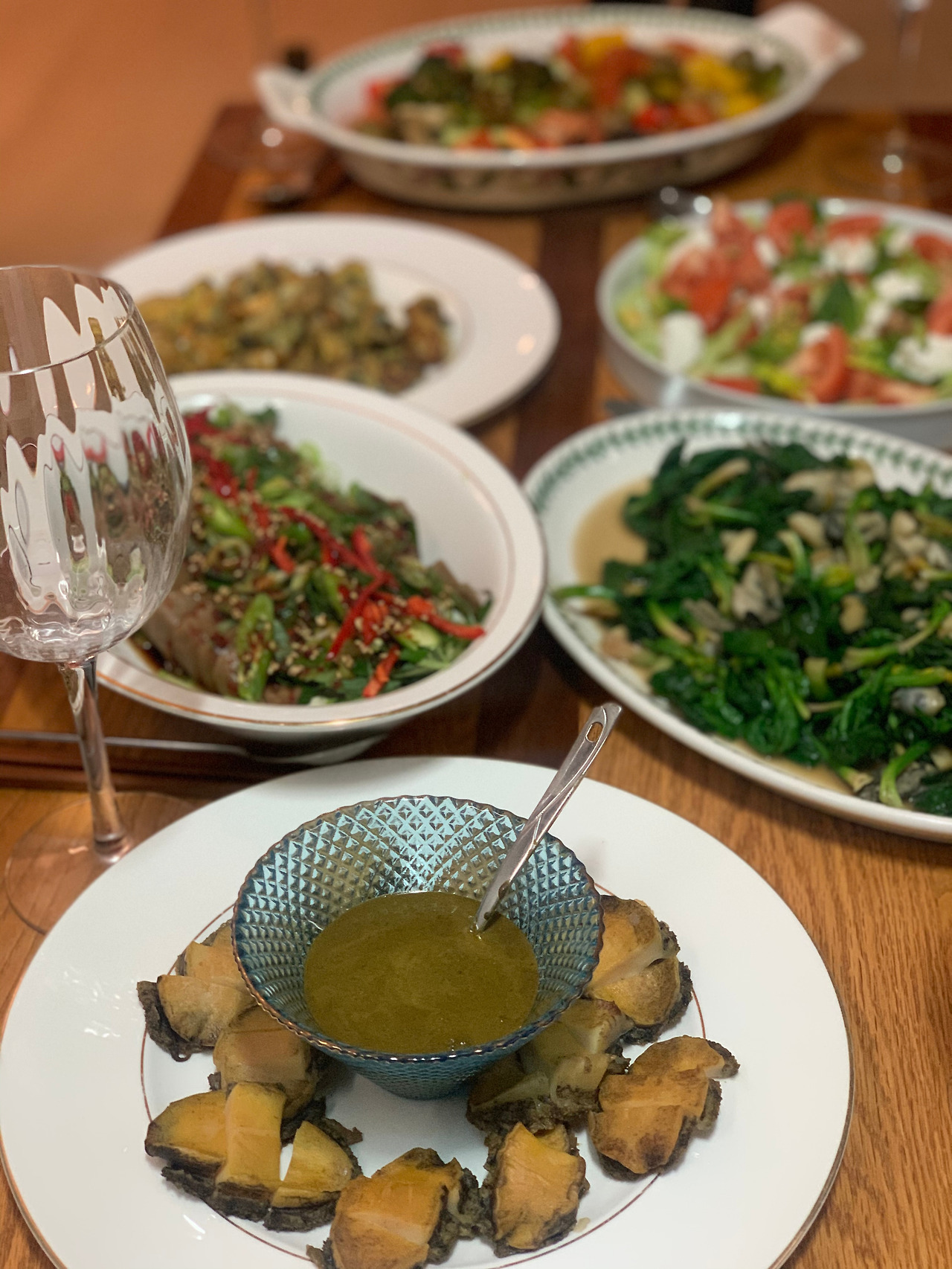 친구에게 배운 도토리묵 무침. 오이깻잎파고추 듬뿍. 시금치굴볶음은 기막힌 안주. 마늘 볶다가 섬초 굴 차례로, 액젓간장참기름 각1. 전복술찜 소스는 K선배 팁에 따라 내장에 간장1 우유3. 굴전은 딸이 부쳤고, 야채구이와 샐러드는 기본. 와인 병이 늘어날 무렵 국물 땡겨 급히 끓인 무국이 끝내줬죠.. 토욜저녁 #마냐밥상