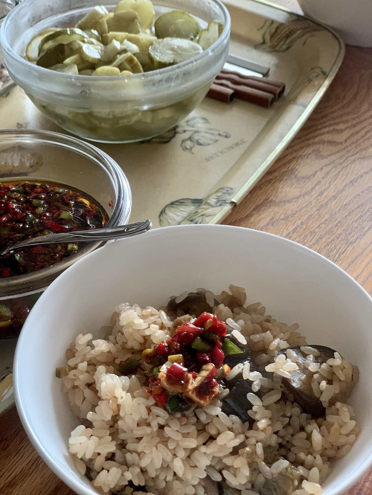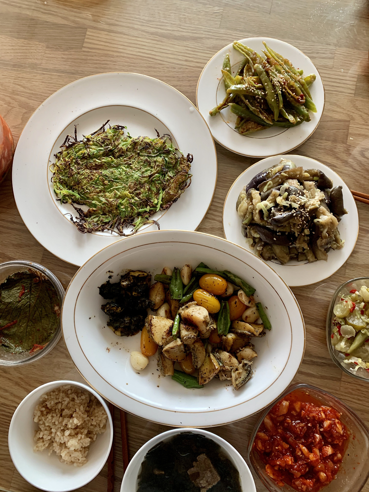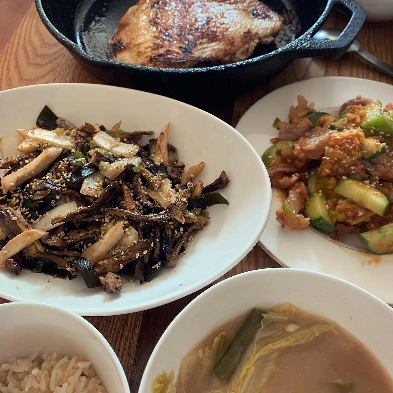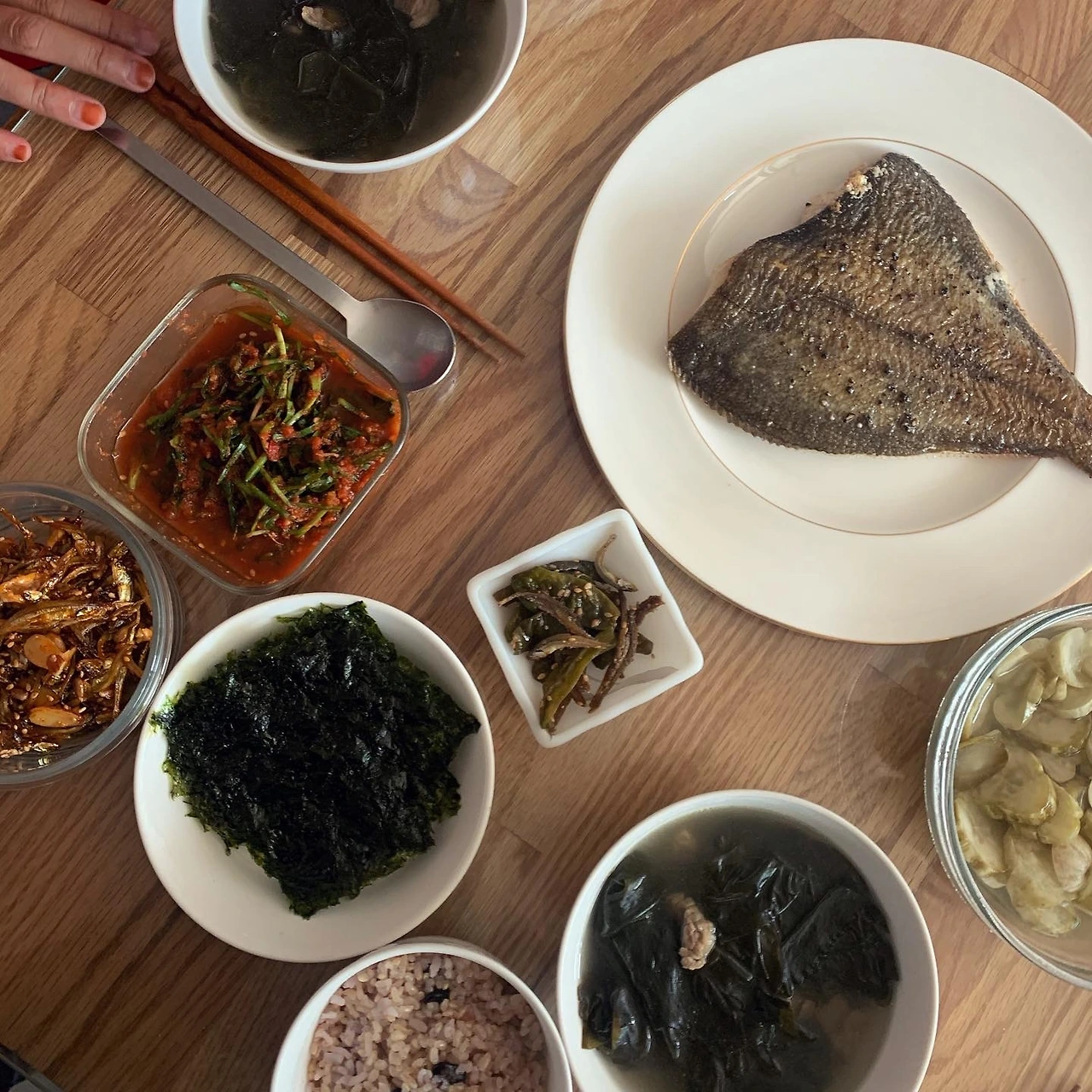 전날 제가 말린 가지를 불려 시든 버섯과 볶고, 일주일 지난 미니족발 남은걸 살 바른뒤 살짝 데쳐 식힌 후 오이와 무친다거나, 사골배추된장국을 끓이고 가자미를 굽고 현미 밥을 따끈하게 새로 해서 밥상을 차렸던 것에 비하면... 에혀. #마냐밥상