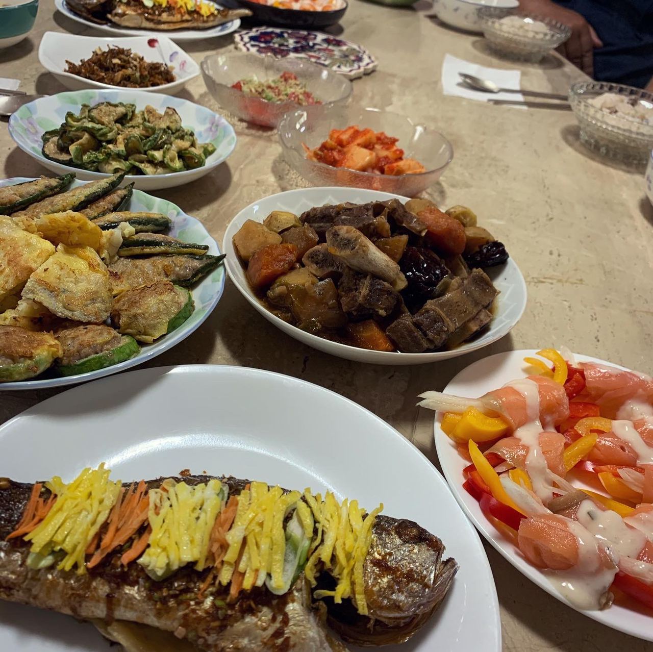 '며느리 노동절'이 아닌 추석은 결혼 이후 처음. 코로나보다는 거동이 불편한 덕분이었다니. 전날 전을 부치지도 않았을 뿐더러, 오늘 시댁 아침도 옆지기와 딸만 간다고. 결국 저도 목발 짚고 갔죠. 눈뜨자마자 파프리카, 양파 채썰어 연어로 돌돌 만 것이 이번 추석 제 음식의 전부. 우여곡절 끝에 친정 모임은 이번에 생략했고, 어제 옆지기와 딸이 이것저것 챙겨서 친정에 갔다가 갈비찜을 얻어왔길래..그걸 들고 시댁 갔어요. 어머님도 전과 조기찜 외엔 별로 하지 않으셨더군요. 작은댁도 안 오셨고요. 딱 가족 식사. 명절 밥상이 이 정도여도, 아무 문제가 없다는걸 어르신들도 아셨으면...