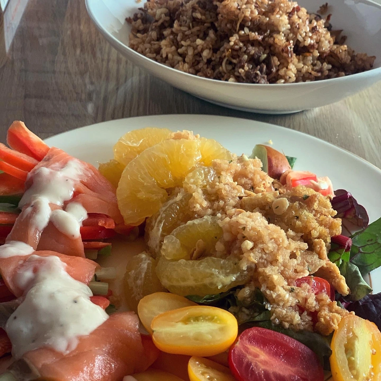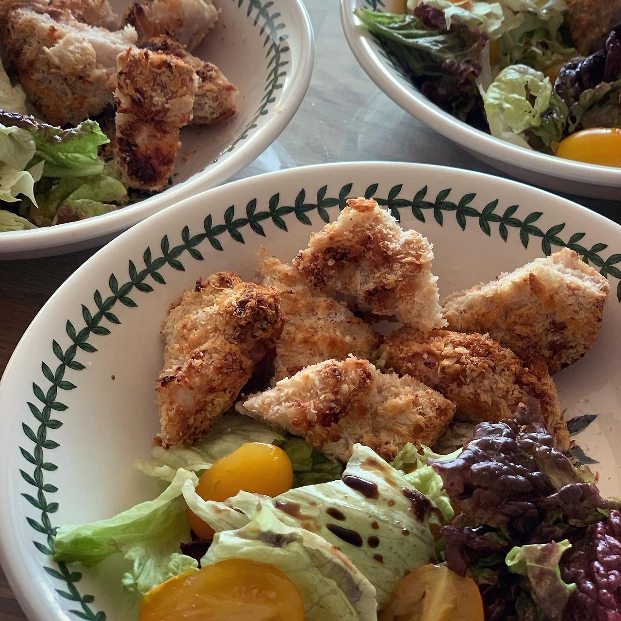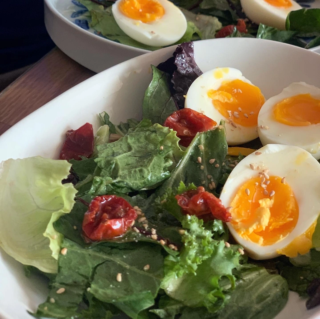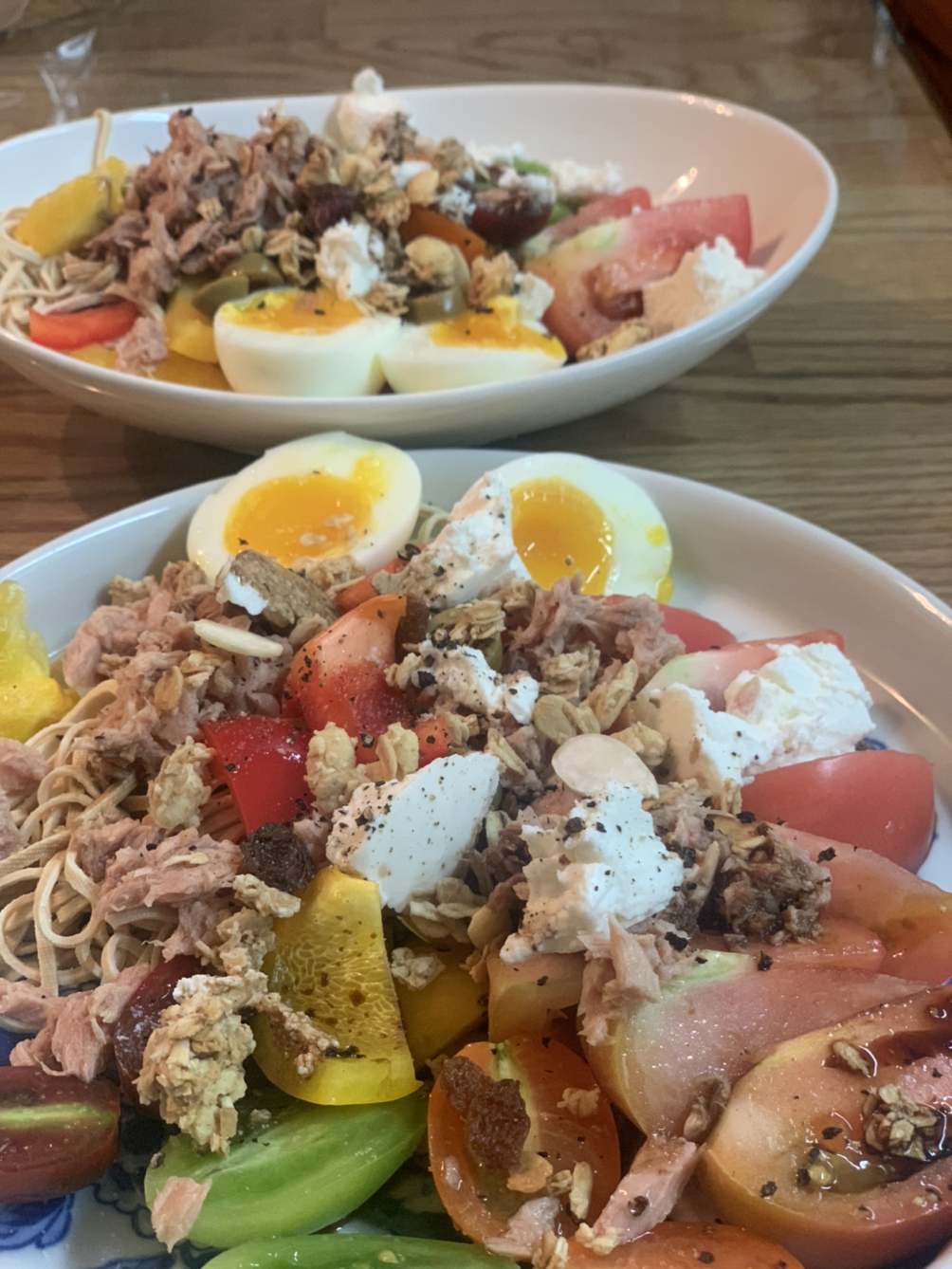 다욧이 절실한 중년 부부의 주말 저녁. 샐러드를 하고 싶은데 토마토와 페타 치즈 뿐. 그래서 색깔 다른 방울토마토와 쪼매 남은 파프리카 조각, 두부면, 뮤즐리, 올리브, 참치, 계란반숙까지 얹었더니 이것이 다욧을 위한 샐러드..일까요. 소금후추 올리브오일 발사믹 끝. 여기에 교토마블 식빵을 기어이 먹은게 함정... 이 샐러드 당분간 변주해보고 싶군요. #마냐밥상