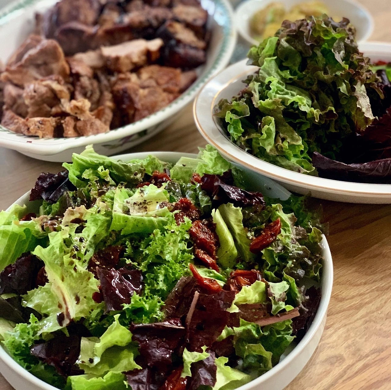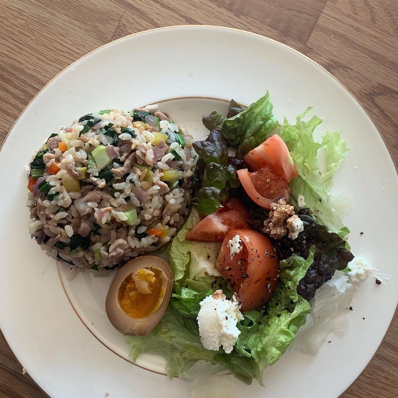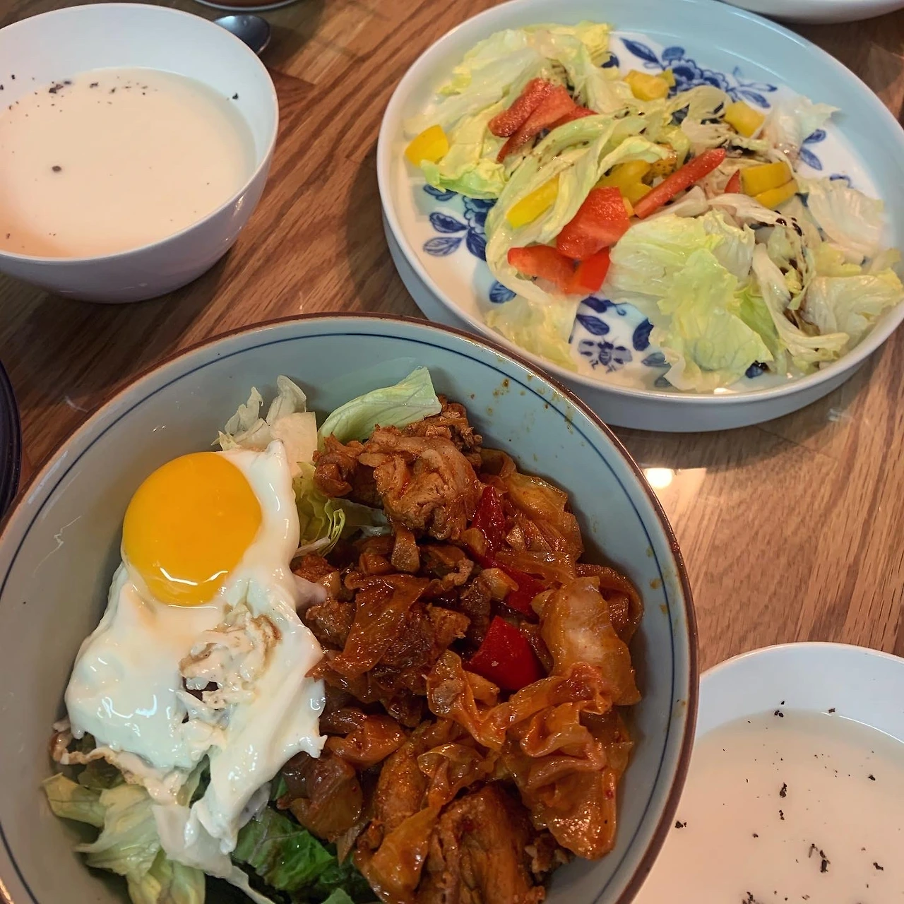 양배추 처치용 제육볶음으로 한 끼 먹고. 냉장고 상추와 양상추를 탈탈 털고 남은 제육볶음을 더해 비빔밥으로 차려낸 건 딸. 야채 처리에 신경쓰는 엄마를 위해 샐러드도 그럴싸하게 곁들이고.