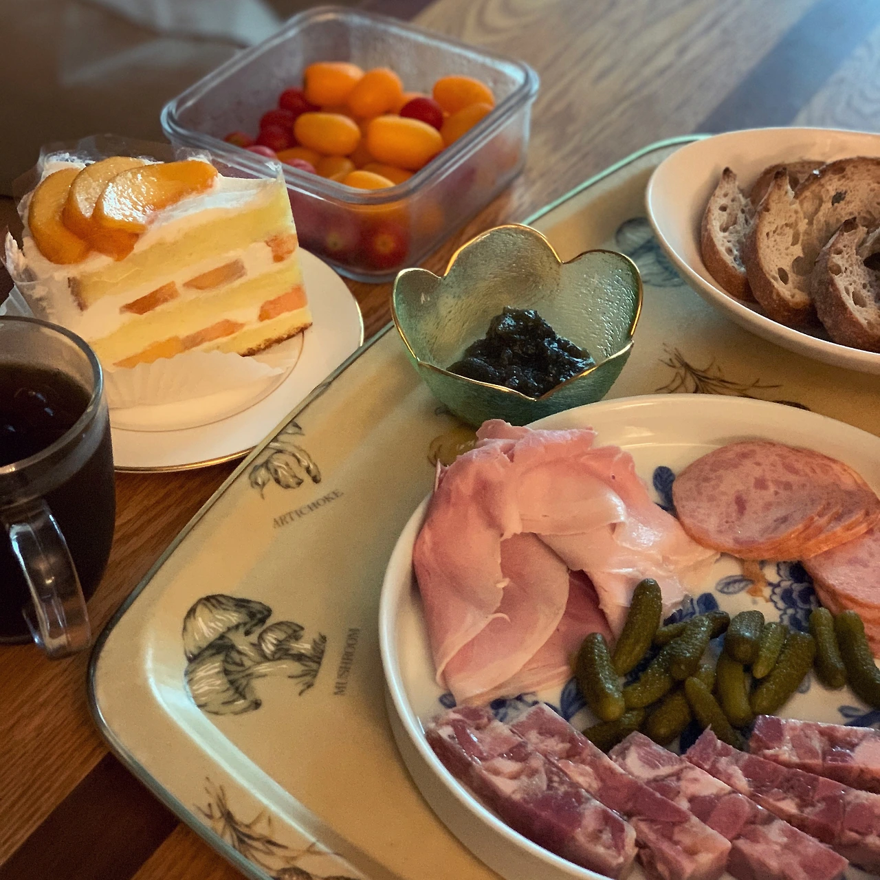 오늘의 병문안. S가 기막힌 샤퀴테리와 복숭아 케이크를 가져왔어요. 잠봉과 테린에 곁들일 피클까지 사온 세심한 님. 냉동실의 깡빠뉴를 구워서 저거 다 해치웠네요. 소뿔농장 가지쨈을 내놓았는데 역시 훌륭. 복숭아 케이크는 소문대로 촉촉하고 부드럽게 녹는 맛. 딱 적당하게 달콤해서 행복했어요. 함께 달달함과 온갖 분노까지 다 나눌 수 있어서 다행. S에게 이 고마움을 어찌 갚을지. 두고두고 오래 잘할게요. 재능 있고 열정 많은 님은 일복이 이어질거 같네요ㅎㅎ