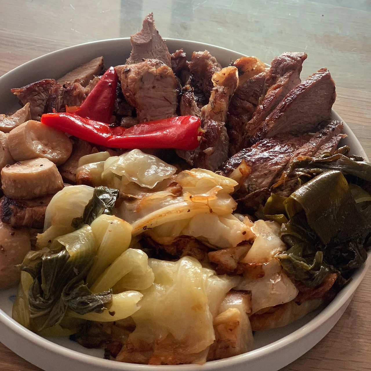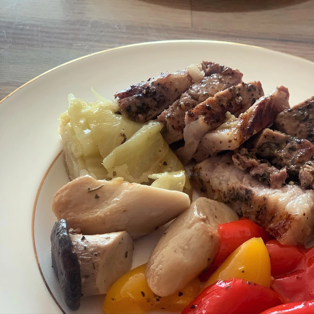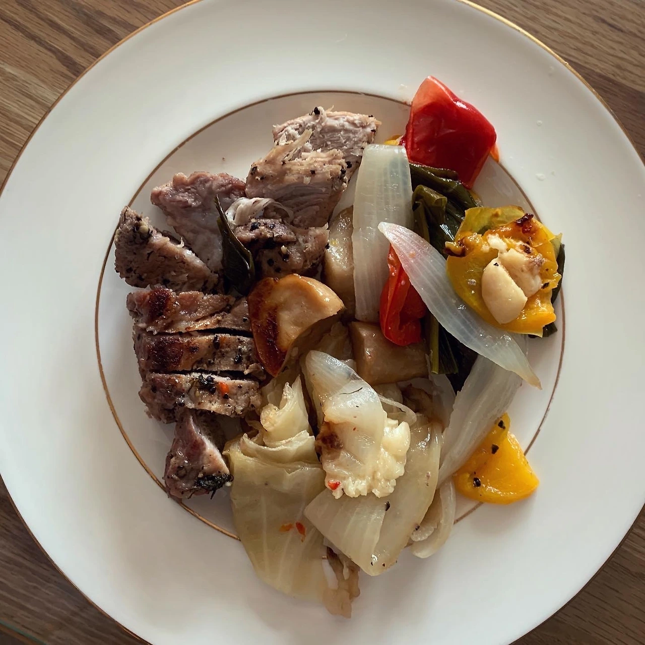 삼겹살 소금후추허브에 40분 오븐구이. 160도로 시작했다가 120도로 낮췄어요. 연기가ㅠ 양배추 버섯, 닭가슴살, 두부면 파마늘 고추 볶았어요. 남은 장어소스 썼어요.