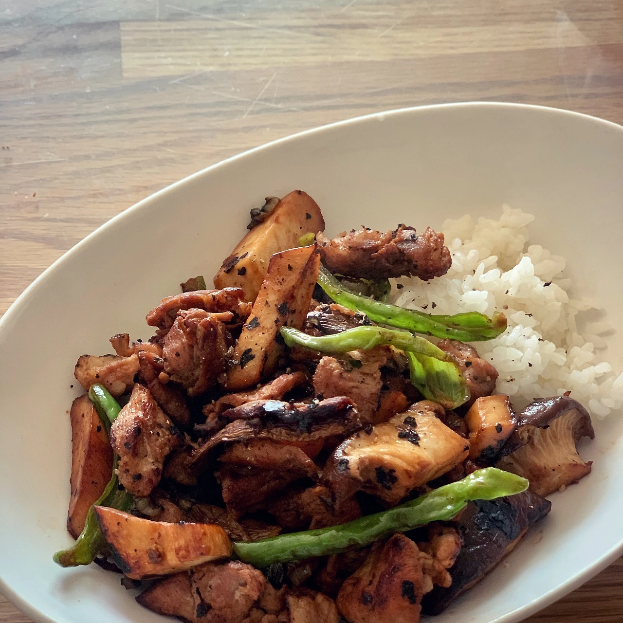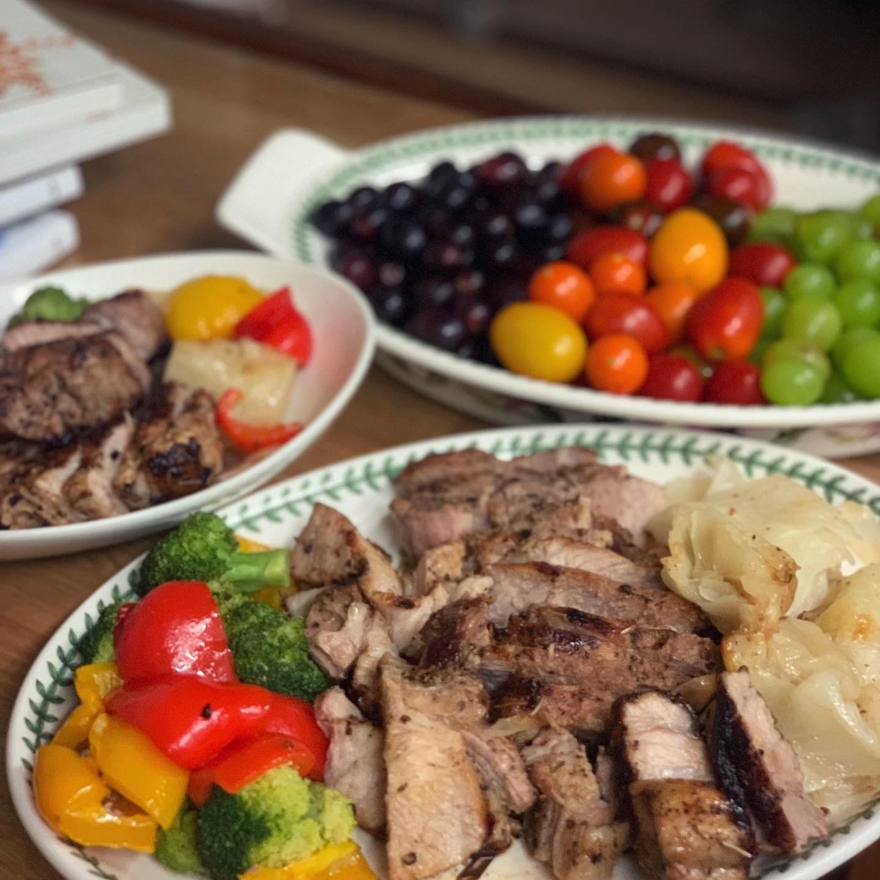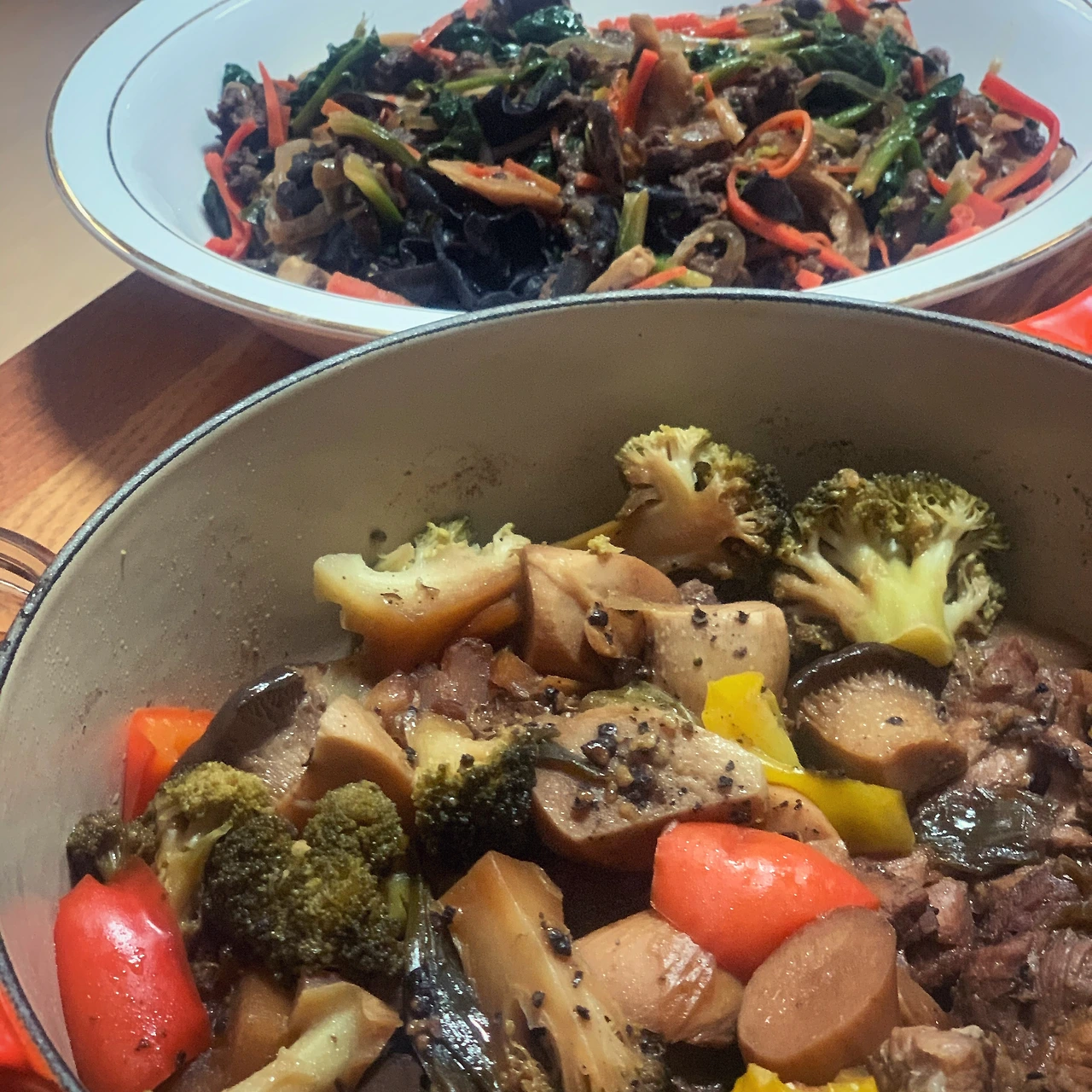 삼겹살 소금후추허브에 40분 오븐구이. 160도로 시작했다가 120도로 낮췄어요. 연기가ㅠ 양배추 버섯, 닭가슴살, 두부면 파마늘 고추 볶았어요. 남은 장어소스 썼어요.