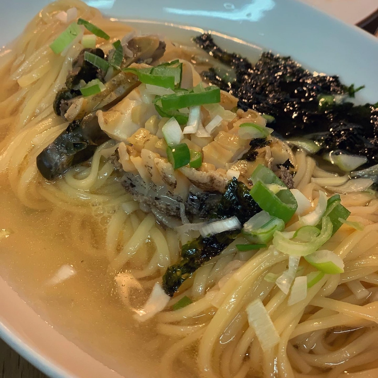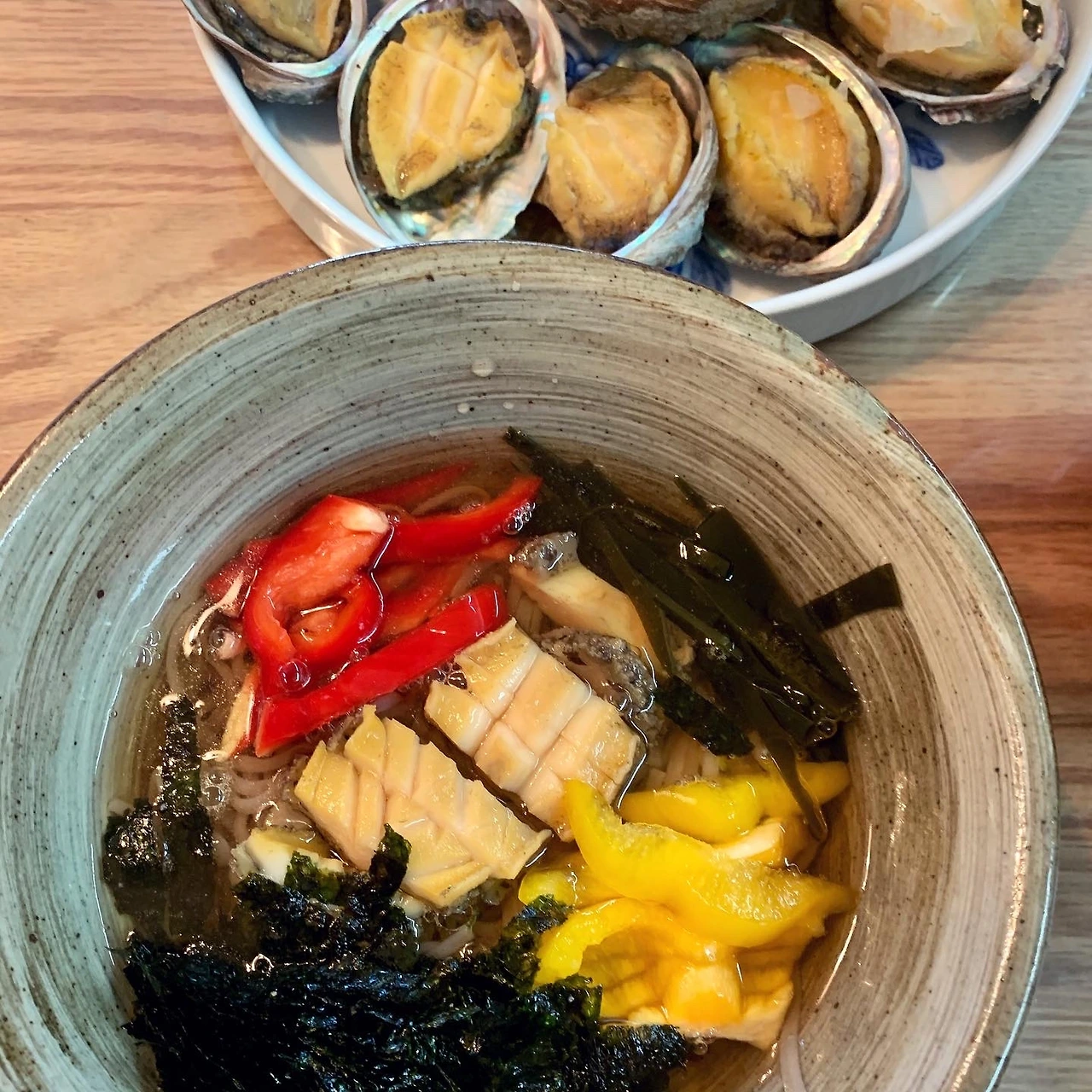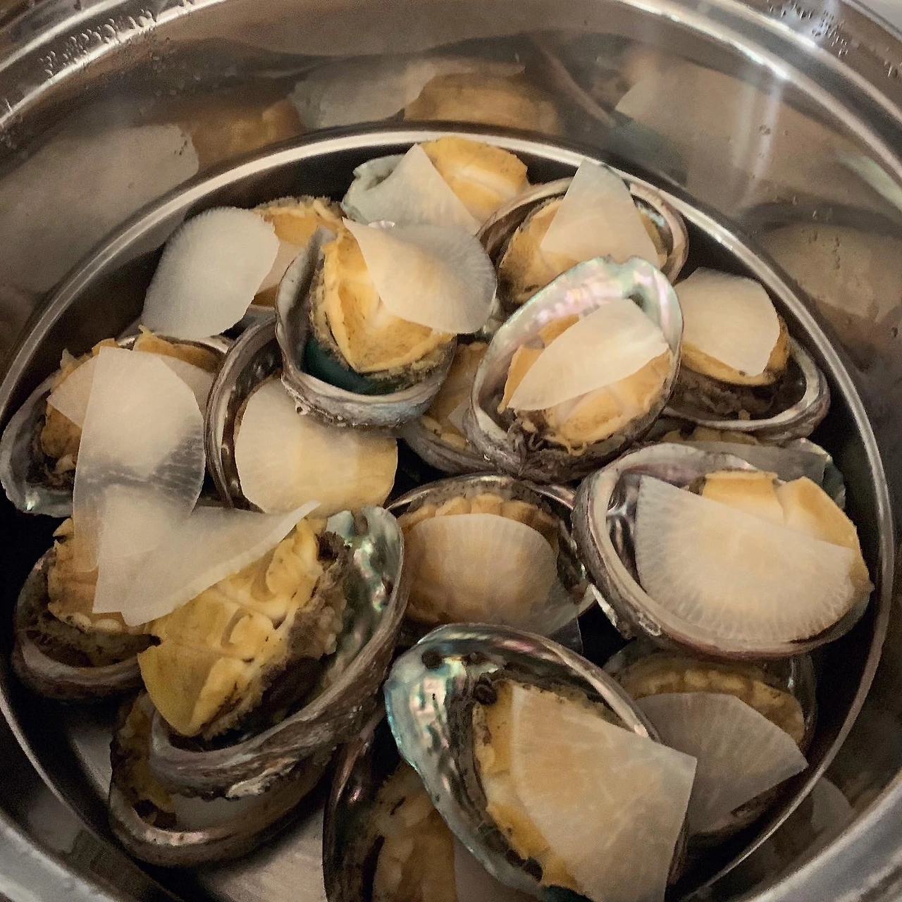 #인어교주해적단 전복 세일에 동생에게도 한 박스 보냈더니 버터구이 해먹었다고 하여, 나름 야심찬 전복술찜 도전기를 공유했어요. - 전복 철수세미로 1차, 칫솔로 2차 씻고. 떼어내어 이빨 제거. - 찜기에 다시마 깔고 전복 껍질채 올린뒤 청하 뿌려줌. 남은 청하는 찜기 아랫칸에 물과 함께. 소금 살짝 뿌리고 얇게 썬 무로 덮어줌.- 끓기 시작하면 아주 약한 불로 바꿔 2시간 반. 다섯 마리는 두 시간 때 미리 꺼내 썰어서 국수장국 부어 냉장고로.- 다시마 우린 물에 국수장국 참치액젓 간해서 냉장고에 식혀둠. (원래는 쯔유에 가쯔오부시 다시가 필요한데 참치액젓으로 흉내만) - 국수 삶은 뒤 찬물에 헹궈 들기름 살짝 버무려 그릇에 담은 뒤, 파프리카, 물 우렸던 다시마 가늘게 썬거, 김 등을 올리고. 미리 식혀둔 전복 올렸음. 그리고 찬 육수 부어줌. (해보니 파프리카 빼고 다시마와 김 정도가 깔끔할듯) - 전복 내장은 술찜 뒤 그 국물 몇 수저에 간장 한 숟가락 더해 갈아서 소스로. 술찜한 전복 찍어 먹었음.- 국수 안하면 술찜은 손질 외 매우 쉬움. 근데 국수 꽤 괜찮음.