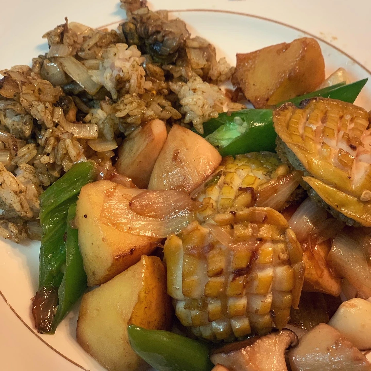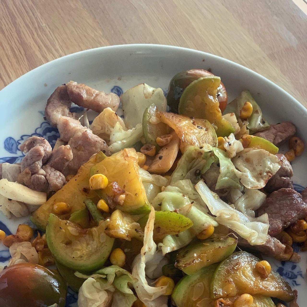 고기 약간 넣어 호박과 양배추, 토마토, 먹다남은 초당옥수수 볶아서 간단 밥상.