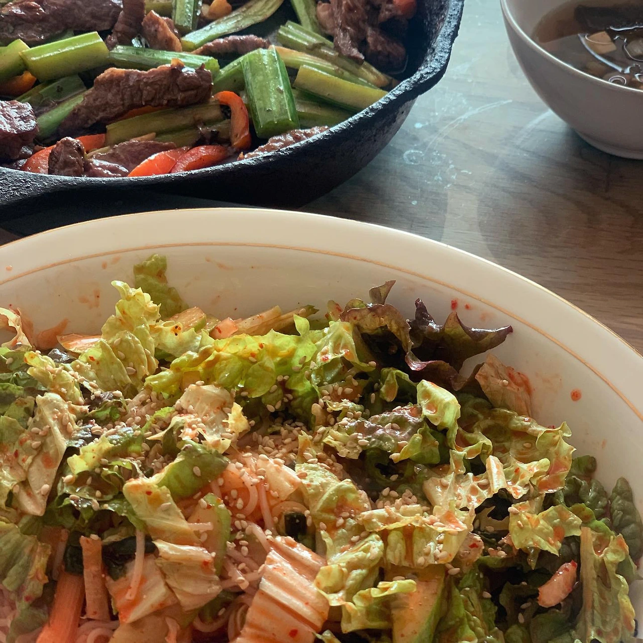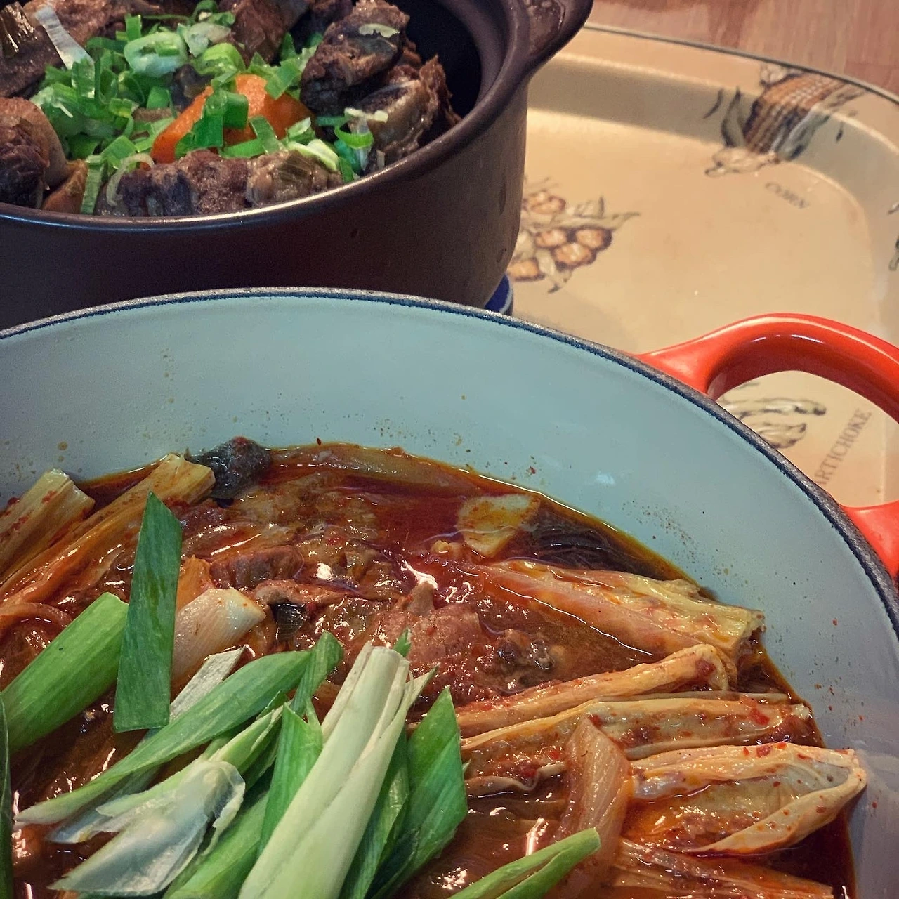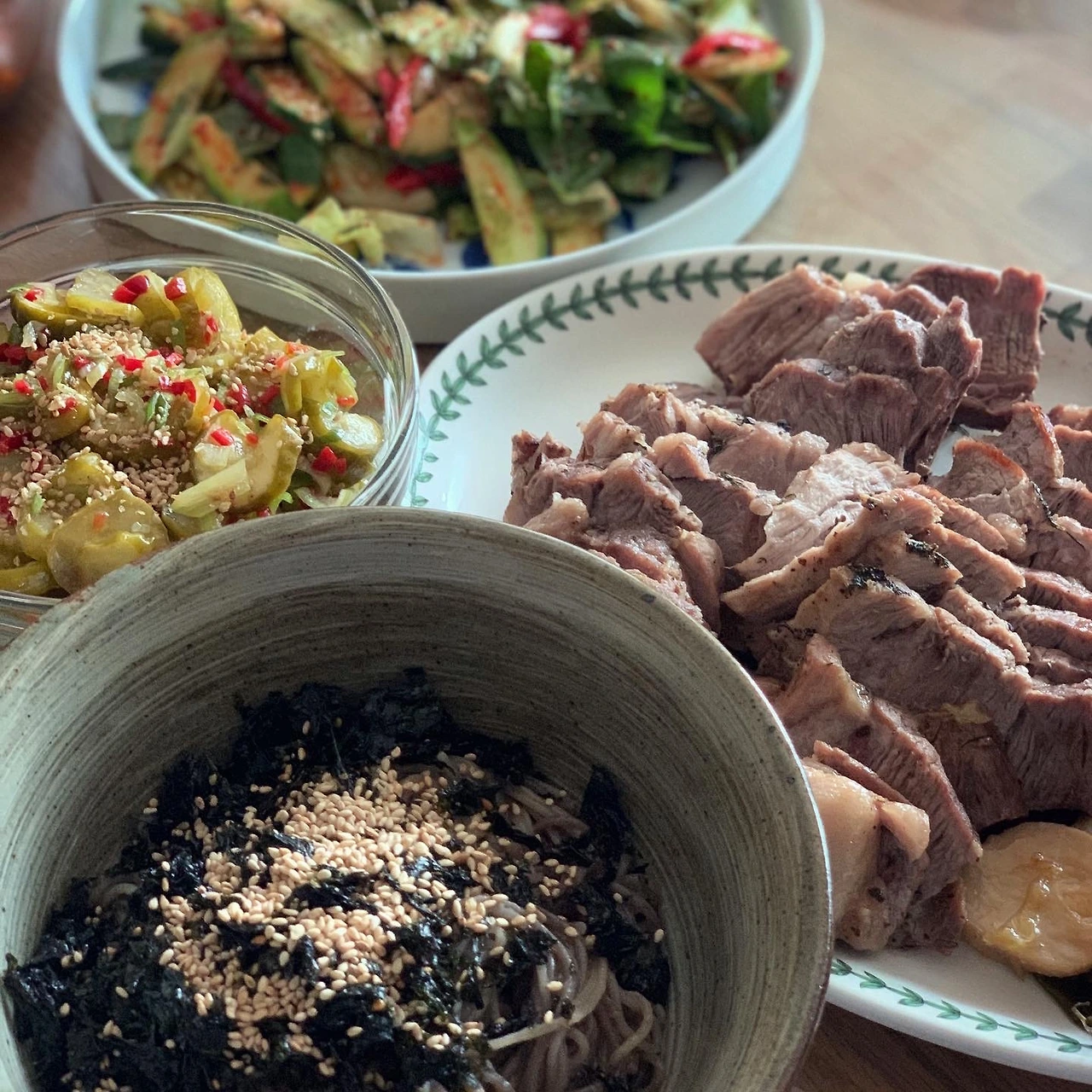 쌈야채 듬뿍 올린 국수에 스테끼 얹어보고. 르쿠르제 아이는 손큰 내가 쓰기에 좀 적다는 생각을 하며 닭볶음탕을 넘칠듯 해봤죠. 그래도 들기름 발라 찬밥 얹고 각종 토핑 얹은 밥이라든지. 무수분수육과 야채찜에 최적화. 소뿔농장 6월 꾸러미 덕분에 #마냐밥상 싱그러웠습니다.